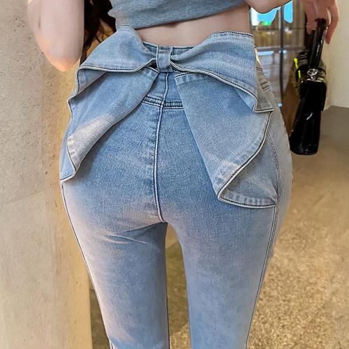 パンツ セクシー レディース マーメイドライン ハイウエスト トレンド エレガント カジュアル 立体的 デニム シルエット シンプル タイト フレア メリハリ リボン 可愛い しっかり 自然 大人 ブルー ホワイト S M L XL