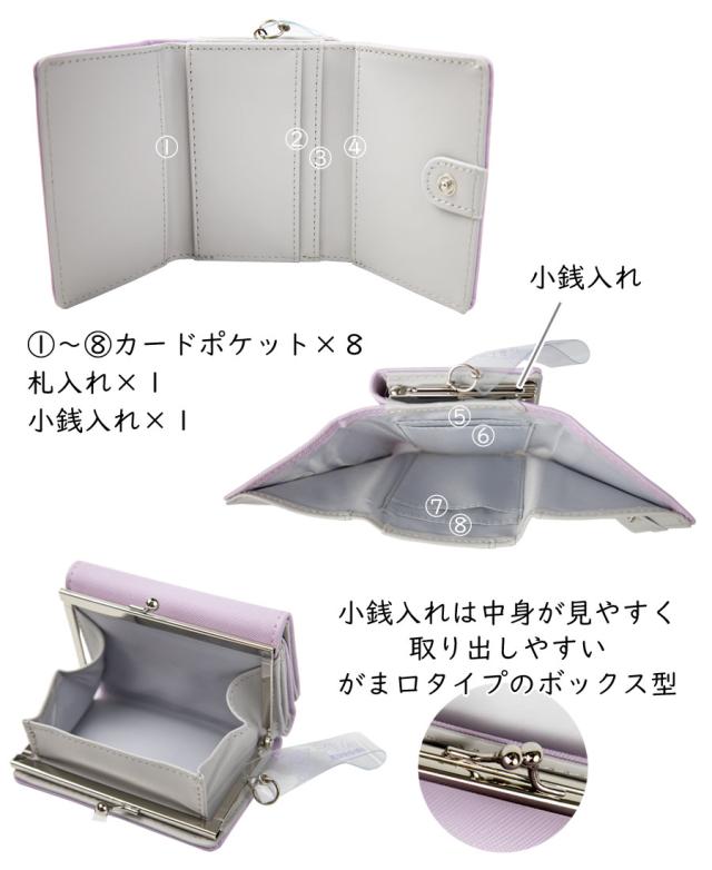 カードは8枚収納可能。札入れ内にもカードポケットがございます。小銭入れは大きく開いて取り出しやすいがま口タイプのボックス型で、小学生 中学生 高校生などのジュニア層に人気のスタイルです。