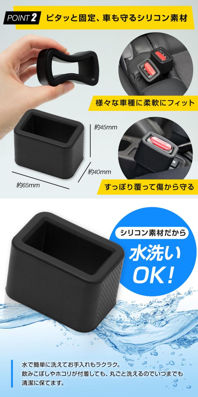 シートベルト装着がもっと簡単に。 バックルをしっかり固定して、片手でもサッと差し込めるシートベルトバックルカバーです。 お子様やご年配の方でも、自分でスムーズにシートベルトを装着しやすくなり、毎日の乗り降りがもっと快適に。 取り付けは、差し込むだけ・はめ込むだけのワンタッチ。 必要なときは簡単に取り外しや位置調整もでき、どなたでも扱いやすい設計です。 柔らかく丈夫なシリコン素材がバックルをしっかりホールドし、車両の内装を傷つける心配もありません。 シート形状にも柔軟にフィットし、幅広い車種に対応します。 汚れたら取り外して水洗いできるため、いつでも清潔をキープ。 カラーは車内に自然に溶け込むブラックで、見た目もスマートです。 2個セット/4個セットから選べるので、車内の使用箇所に合わせて揃えられます。 |