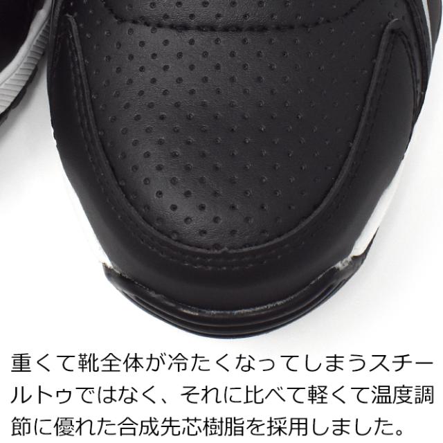 アッパーにパンチング生地(合成皮革)を使用し通気性をアップしたAIRWALK(エアウォーク)のセーフティスニーカー。樹脂先芯・耐滑仕様のアウトソール・ヒールカップインソールなど機能性も充実。3本の面ファスナーでフィット感が調節できしっかり固定されます。