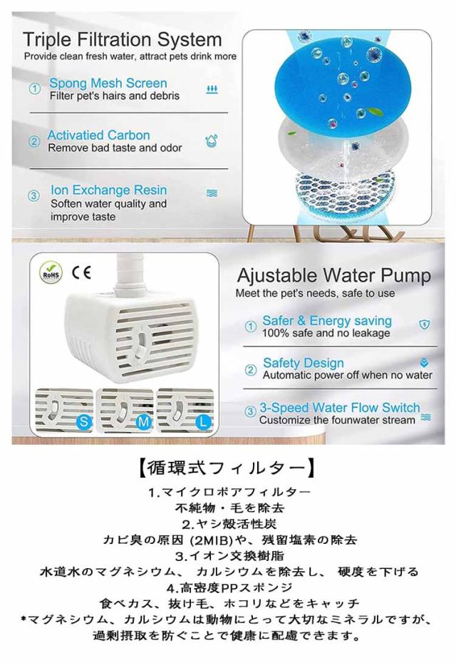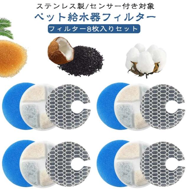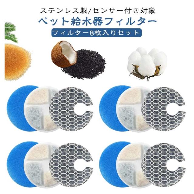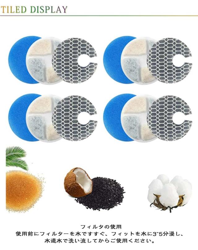 | ペット給水器フィルター フィルター8枚入りセット ステンレス製/センサー付き対象 フィルタの使用 使用前にフィルターを水ですすぐ、フィットを水に3~5分浸し、水道水で洗い流してからご使用ください。 【循環式フィルター】 1.マイクロポアフィルター 不純物・毛を除去 2.ヤシ殻活性炭 カビ臭の原因 (2MIB)や、残留塩素の除去 3.イオン交換樹脂 水道水のマグネシウム、 カルシウムを除去し、 硬度を下げる 4.高密度PPスポンジ 食べカス、抜け毛、ホコリなどをキャッチ *マグネシウム、カルシウムは動物にとって大切なミネラルですが、 過剰摂取を防ぐことで健康に配慮できます。 | |