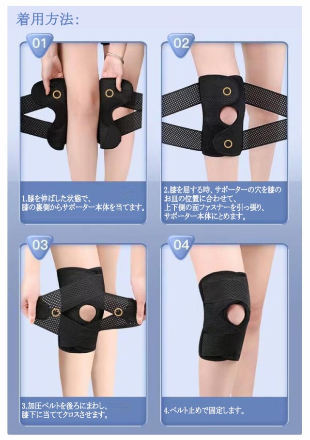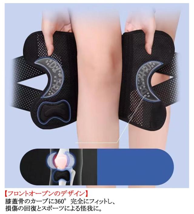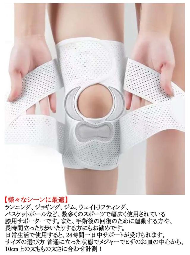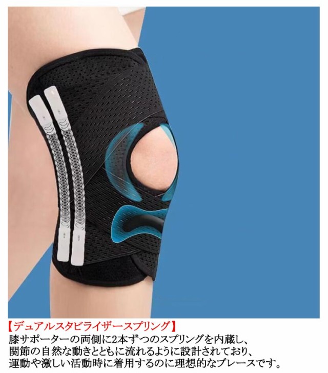 | 【再発防止と痛み対策の両方にアプローチ】傷ついた筋肉、靭帯、腱にテーピングやサポーターを用いることで、その部位の補強ができ、怪我の再発防止や悪化防止につながります。 【効果的な保護をしてくれる膝用 サポーター】膝の皿の両側に月形パッドにより、膝関節の圧力が大幅に低減し、半月板損傷を緩和できます。 【関節や筋肉、靭帯、腱をがっちり補強】膝に巻くV型マジックテープを2本、膝の上下に交差して、膝蓋骨の安定に役立ちます。左右のぐらつきも防止しながら、今までにない最高のホールド感を体験できる膝サポーター。 【デュアルスタビライザースプリング】膝サポーターの両側に2本ずつのスプリングを内蔵し、関節の自然な動きとともに流れるように設計されており、運動や激しい活動時に着用するのに理想的なブレースです。 【人間工学的なひざ用サポーター】曲げ伸ばしの多い膝頭や裏側は、食い込みを防いでカーブカット構造になっています。メッシュ生地採用ですので、ムレにくいのもポイントです。 【フロントオープンのデザイン】膝蓋骨のカーブに360°完全にフィットし、損傷の回復とスポーツによる怪我に。 【幅広のマジックテープを採用】マジックテープ式なので、サポーターの締め付けを簡単に調整することが可能です。 【簡単に着け外しOK】ボトムを履いたまま簡単に着け外しできるフルオープンタイプの膝サポーターです。 【様々なシーンに最適】ランニング、ジョギング、ジム、ウェイトリフティング、バスケットボールなど、数多くのスポーツで幅広く使用されている膝用サポーターです。また、手術後の回復のために運動する方や、長時間立ったり歩いたりする方にもお勧めです。日常生活で使用すると、24時間一日中サポートが受けられます。 サイズの選び方 普通に立った状態でメジャーでヒザのお皿の中心から、10cm上の太ももの太さに合わせ計測! 着用方法: 1.膝を伸ばした状態で、膝の裏側からサポーター本体を当てます。 2.膝を屈する時、サポーターの穴を膝のお皿の位置に合わせて、上下側の面ファスナーを引っ張り、サポーター本体にとめます。 3.加圧ベルトを後ろにまわし、膝下に当ててクロスさせます。 4.ベルト止めで固定します。 【いつでも快適な着用感】このひざサポーターは通気性、吸汗速乾性に優れ、汗をかいてもサラッと快適です。 | |
