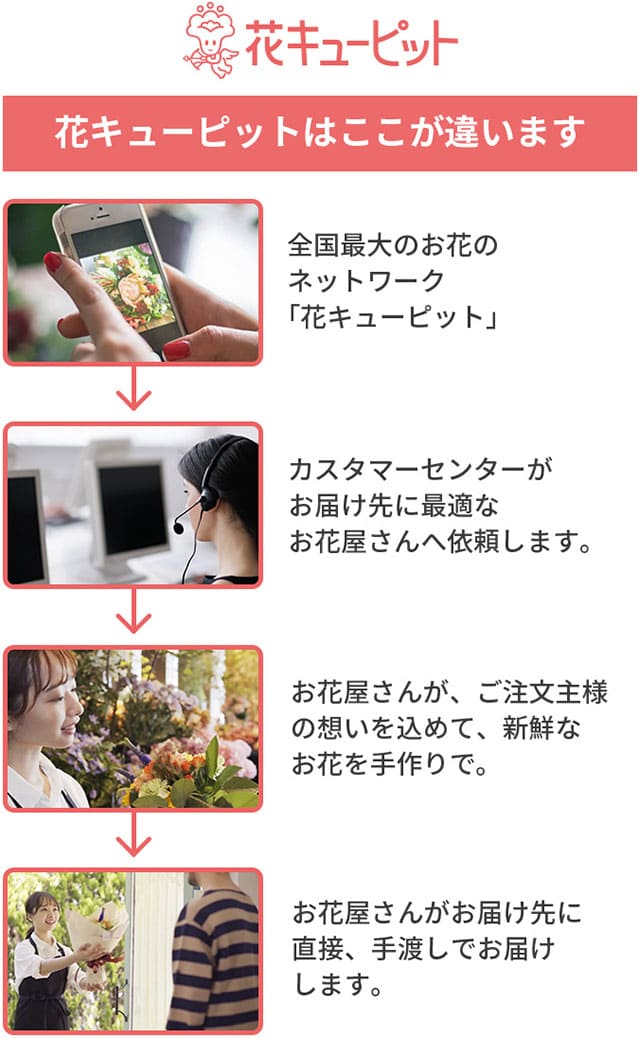 | インターネット花キューピットとは? 全国約4,000店以上の加盟店からなる安心と信頼のネットワーク。お届け先近くの加盟花店から、新鮮なお花をスピーディにお届けします。 |