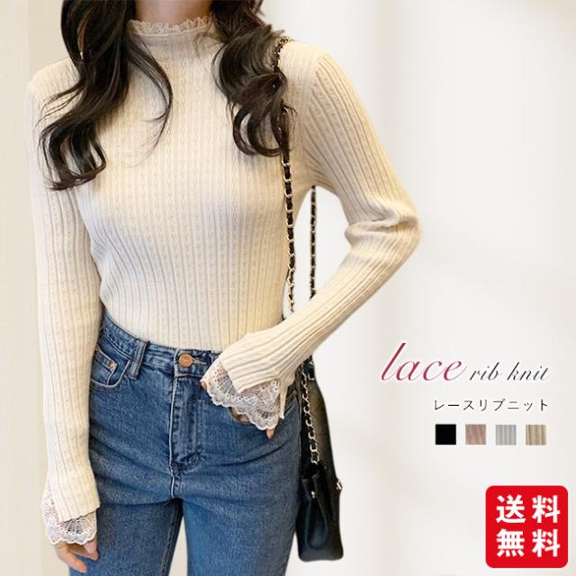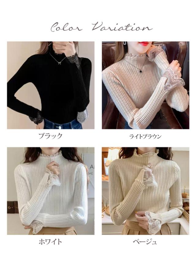 10倍ポイント返還!春新作 ニット 袖レース レディース ニットセーター トップス 長袖 ハイネック 重ね着風 フレア袖 レースニット カットソー リブニット フリルネック フィット 柔らかい 可愛い 着痩せ 体型カバー 秋冬 春 おしゃれ ポイント消化