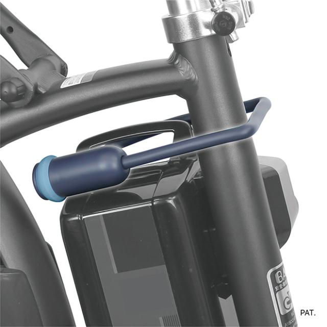 ・各メーカーの電動アシスト車のバッテリーとシートチューブまでを計測し、足や衣服の妨げにならない四角形。走行中に外す必要がありません。