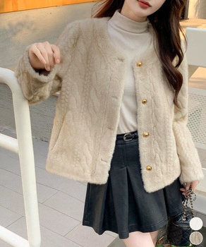 ふわふわのフェイクファー素材を使用したノーカラージャケット。