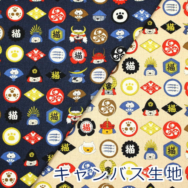 【10cm単位価格】家紋 猫 ネコ にゃんこ 和柄 綿麻 キャンバス コットンリネン 綿85% 麻15% 生地 布 約110cm幅 コットンこばやし KTS7139 ゆうパケット2m対応 ( ハンドメイド 手作り 日本製 手芸 裁縫 巾着 雑貨小物 )