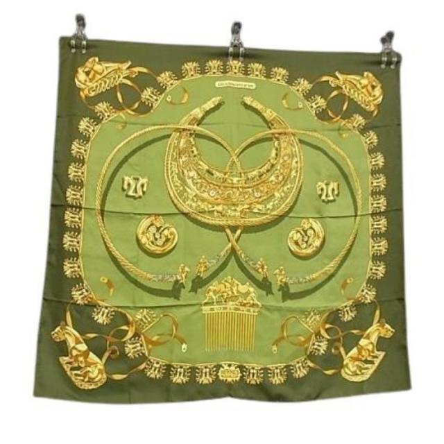 HERMES エルメス スカーフ カレ90 グリーン系 シルク100% レディース CAVALIERS D’OR 黄金の騎士 美品 【本物保証】
