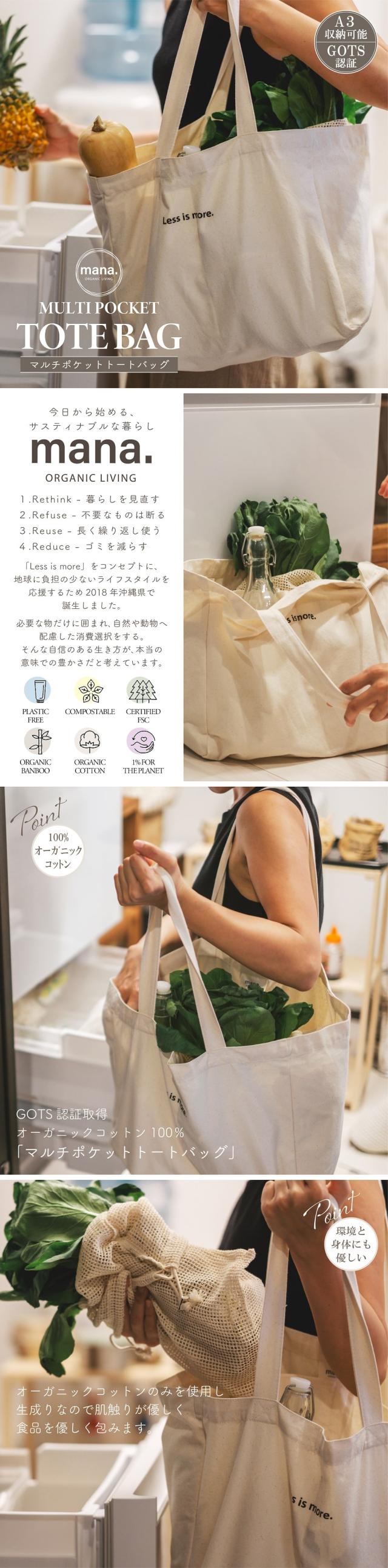 エコバッグ mana. マルチポケットトートバッグ GOTS認証オーガニックコットン100%製 A3収納可能 大容量 6ポケット 畳める 丸洗い可 男女兼用 買い物用 パソコン収納可 飲料 ボトル 軽量 コンパクト おりたたみ 旅行 サブバッグ ファッション ミニマル エシカル SDGs