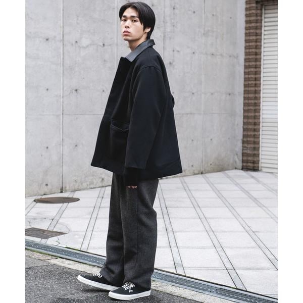 素材の良さと衿の切り替えが程よく全体を引き締めてくれます。ラフになりすぎずモードな印象になるのがおすすめポイント