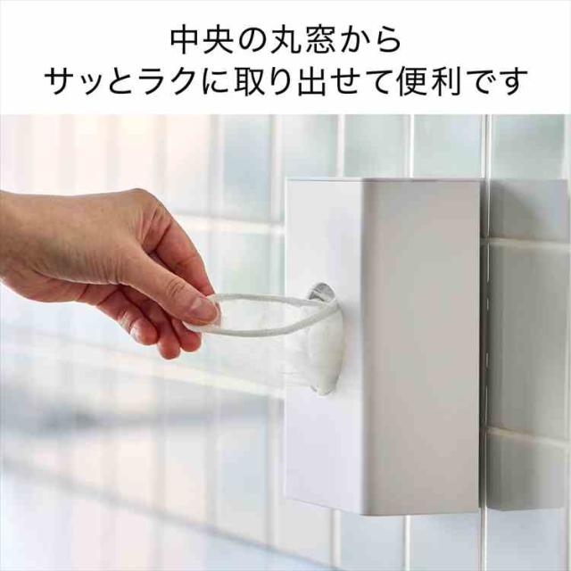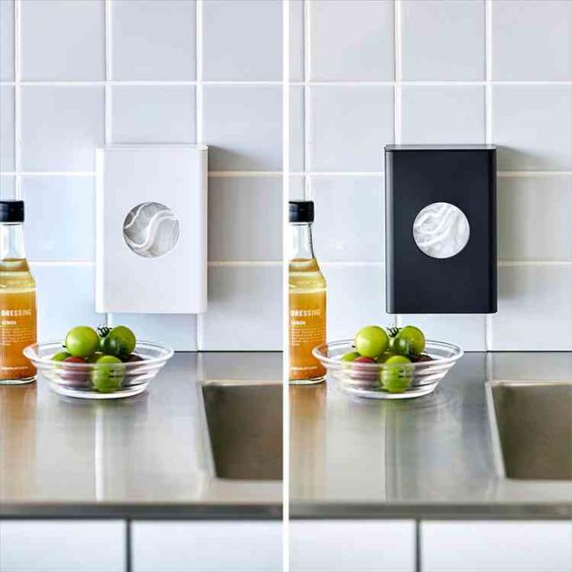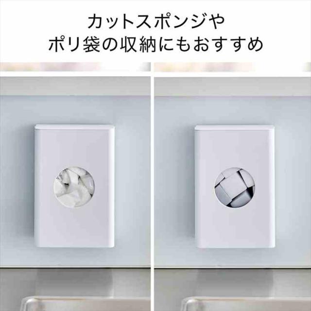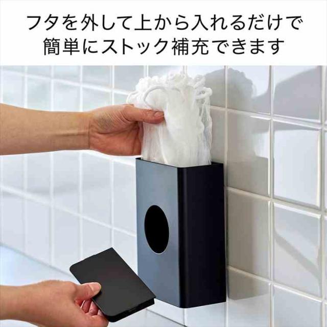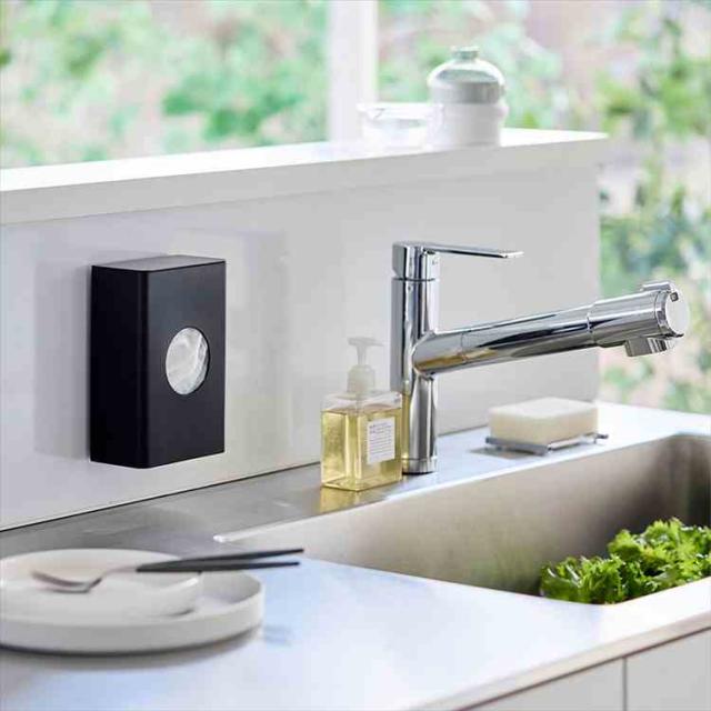 フィルムフックでキッチンパネルやタイルに簡単に取り付けられるホルダーです。よく使う水切りネットを、中央の丸窓からサッと取り出せます。壁面に取り付けたまま蓋を開けるだけで簡単に補充できるのも便利。カットスポンジやポリ袋などの収納にもおすすめです。