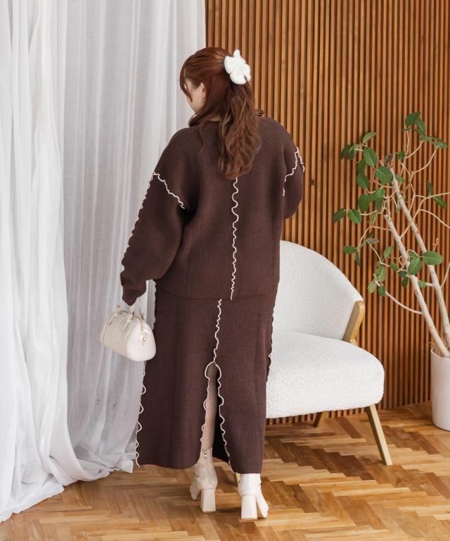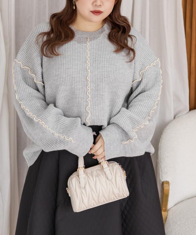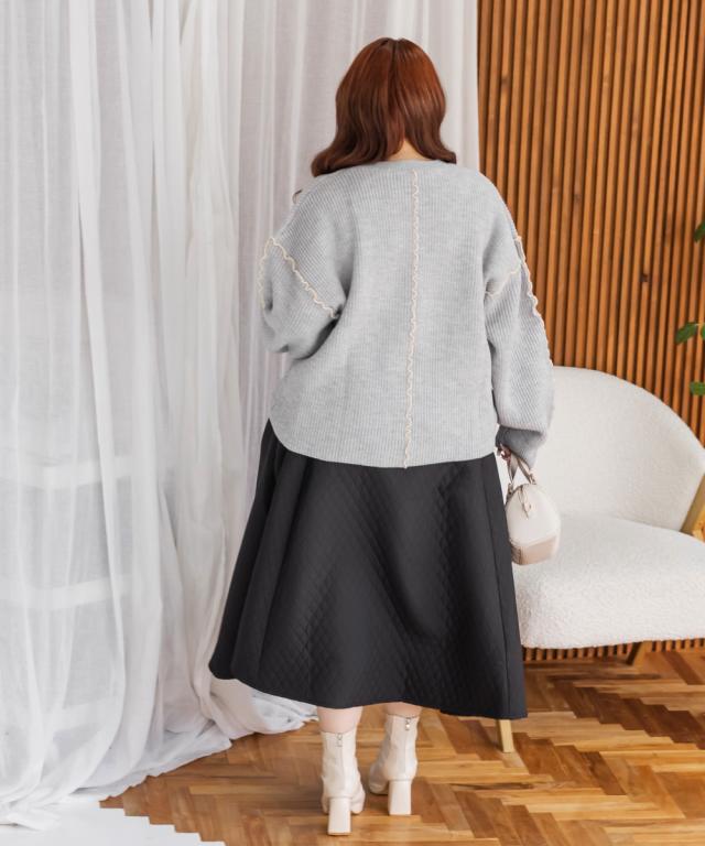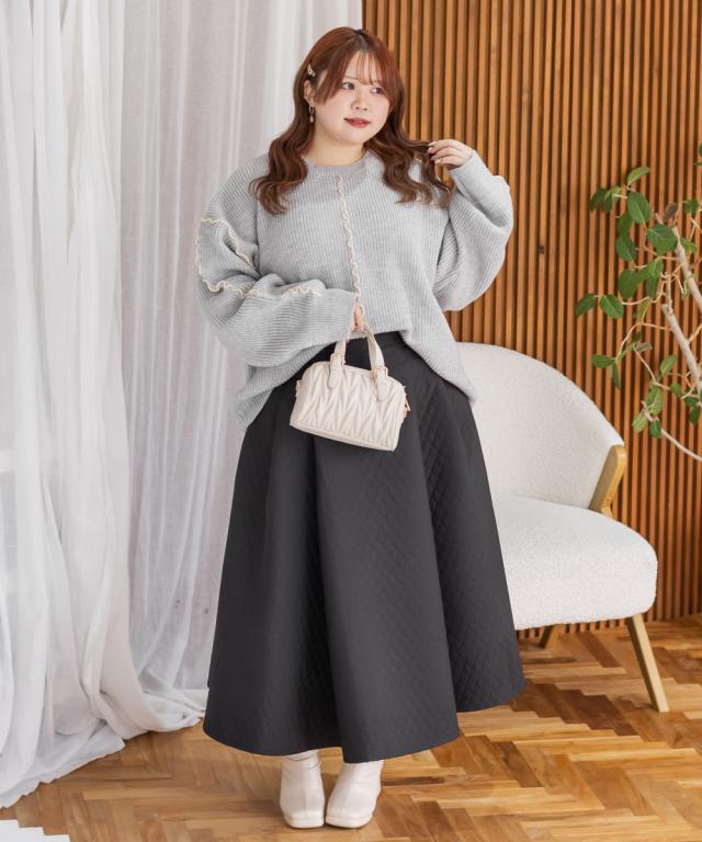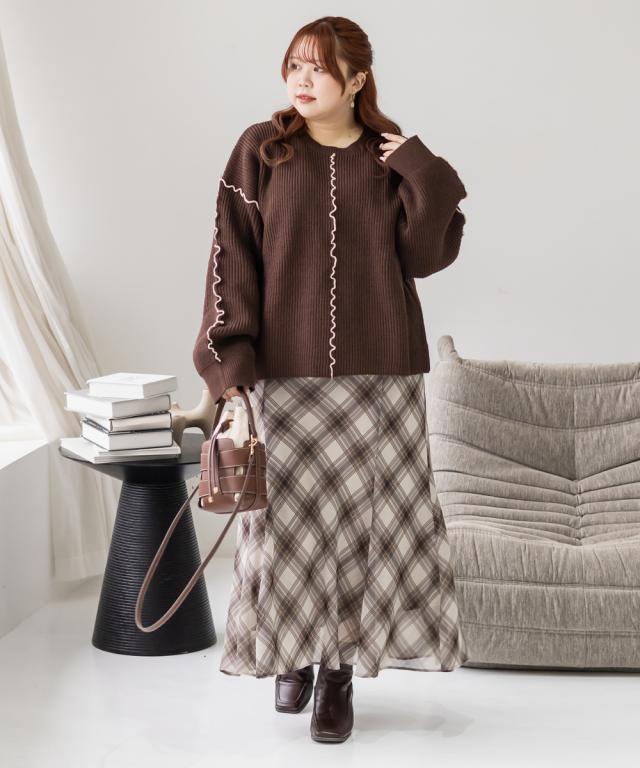 | 3Lサイズを着用してゆるっとしたサイズ感でした。オーバーサイズでかわいいニットです!抜け感とメリハリをプラスしてくれる配色のメローデザインがとってもかわいいです!合わせるだけでこなれ感がでるお洒落なアイテムです◎セットアップで着用出来て、ニットワンピースのような雰囲気になれて、大人っぽく着こなせます♪冬らしいスタイリングが楽しめるアイテムです! |