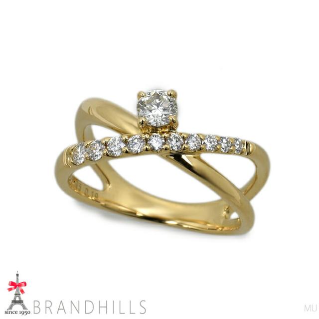中央には輝く一粒のダイヤモンド、それを引き立てるかのようにあしらわれたメレダイヤモンド。指の華奢さが引き立つ華やかなクロスデザインのリングです。