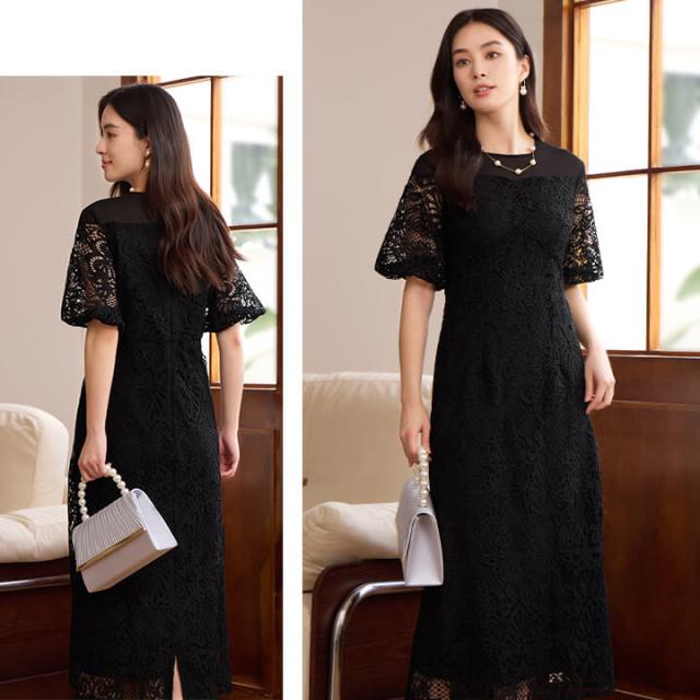 フラワーレース ロングドレス ドレス ワンピース フォーマル エレガント スリット入り 上品 優雅 ラウンドネック パーティードレス ロング丈 ミモレ丈 レディース セレモニードレス シアーレース フェミニン 五分袖 七分袖 タイト 結婚式 謝恩会 発表会 食