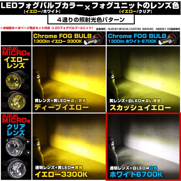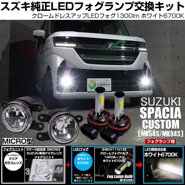 スズキ スペーシアカスタム (MK54S/MK94S) 対応 MICRO led クロームフォグ 1300lm クリアガラスレンズ ユニット フォグランプキット ホワイト H11 44-O-4