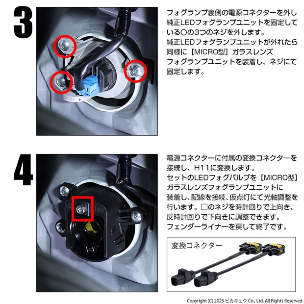 ◆フォグランプが装着されていない車両に取り付ける場合は、フォグランプスイッチやハーネスを別途ご用意いただいたり、バンパーの加工が必要になることがあります。