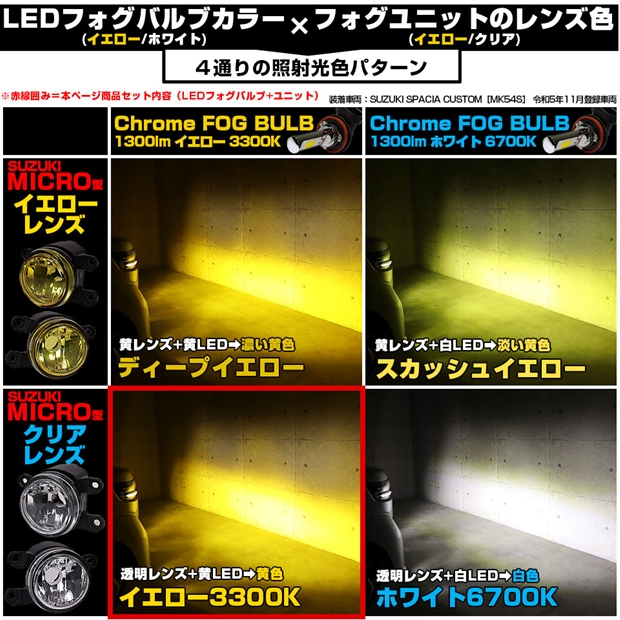 スズキ スペーシアカスタム (MK54S/MK94S) 対応 MICRO led クロームフォグ 1300lm クリアガラスレンズ ユニット フォグランプキット イエロー H11 44-O-5