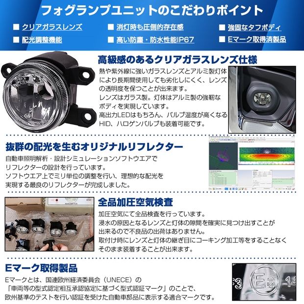 高い質感と耐久性を実現するEマーク認証クリアガラスレンズフォグユニット