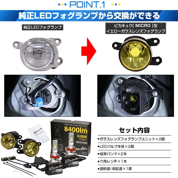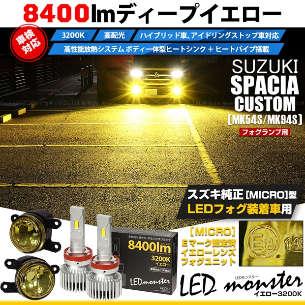 スズキ スペーシアカスタム (MK54S/MK94S) 対応 MICRO バルブ LED MONSTER L8400 イエローガラスレンズ フォグランプキット 8400lm イエロー 3200K H11 44-P-3