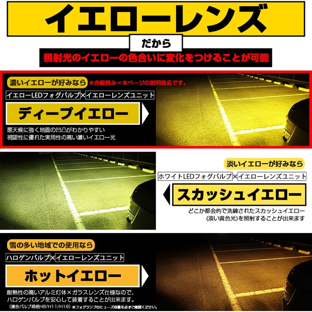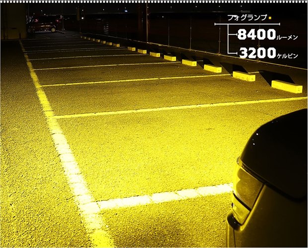 イエローレンズにLEDイエロー光を通すのでフォグの照射光は「濃いイエロー光=DEEP YELLOW」になります。イエローレンズなので非点灯時も抜群のアピール性を発揮します。