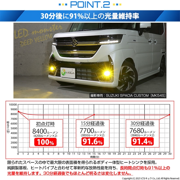 明るさ全光束8400ルーメンの最強のモンスターフォグランプLEDバルブです。放熱性能が高いため、長時間点灯後も91%以上の光量を維持します。30分経過後もほとんど明るさが変化しない放熱対策を施しています。純正球の配光特性に徹底的にこだわり、理想的な配光を実現しています。
