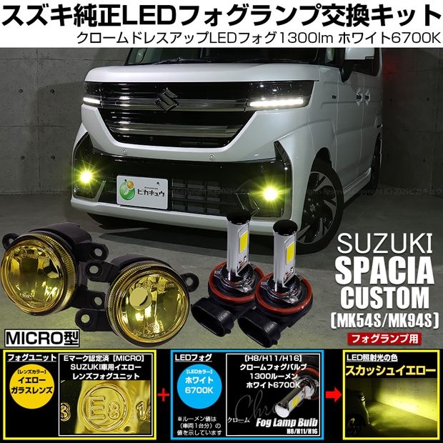 スズキ スペーシアカスタム (MK54S/MK94S) 対応 MICRO led クロームフォグ 1300lm イエローガラスレンズ フォグランプキット ホワイト H11 44-P-4