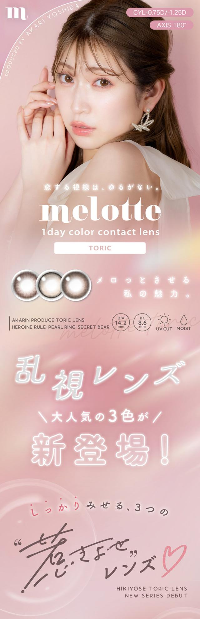 【ポイント5倍】 乱視用 カラコン ワンデー メロットトーリック 度あり 1箱10枚入り吉田朱里 アカリン melotte DIA14.2mm BC8.6 水光感 色素薄い系 高度数 ハイパー 透明感 ナチュラル 自然 ぼかしフチ 馴染む 細フチ 大人可愛い