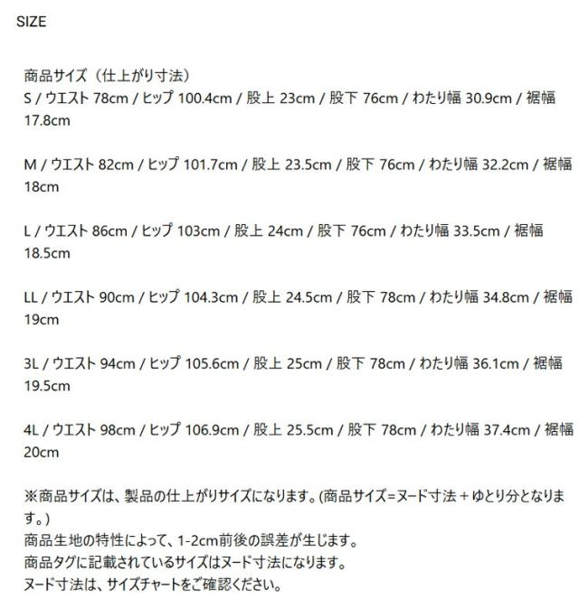 | サイズ | M / ウエスト 82cm / ヒップ 101.7cm / 股上 23.5cm / 股下 76cm / わたり幅 32.2cm / 裾幅 18cm L / ウエスト 86cm / ヒップ 103cm / 股上 24cm / 股下 76cm / わたり幅 33.5cm / 裾幅 18.5cm LL / ウエスト 90cm / ヒップ 104.3cm / 股上 24.5cm / 股下 78cm / わたり幅 34.8cm / 裾幅 19cm |