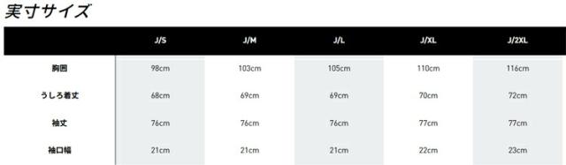 | 実寸サイズ(cm) | M:胸囲103cm、後ろ着丈69cm、袖丈76cm、袖丈幅21cm L:胸囲105cm、後ろ着丈69cm、袖丈76cm、袖丈幅21cm XL:胸囲110cm、後ろ着丈70cm、袖丈77cm、袖丈幅22cm |