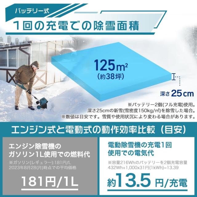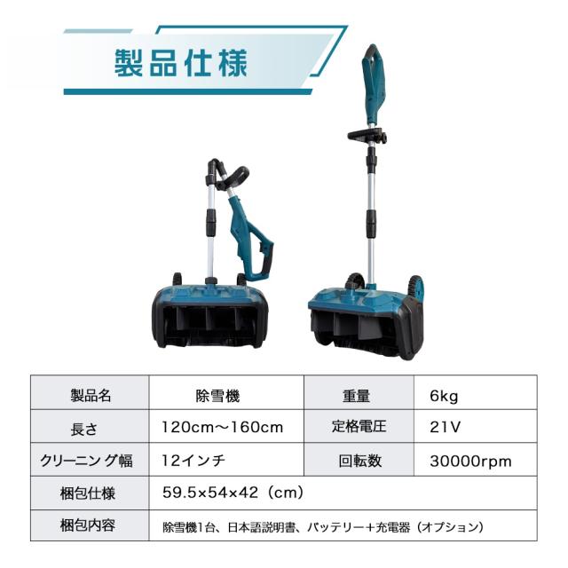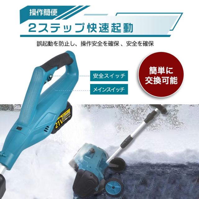 【大容量バッテリー】 電動除雪機には3.0 Ahの大容量バッテリーが搭載されています。高性能バッテリーにより、長時間の作業が可能で、一回の充電で最大30分間稼働します。これにより、柔軟性が向上し、頻繁な充電が不要になり、ユーザーにとってより便利です。