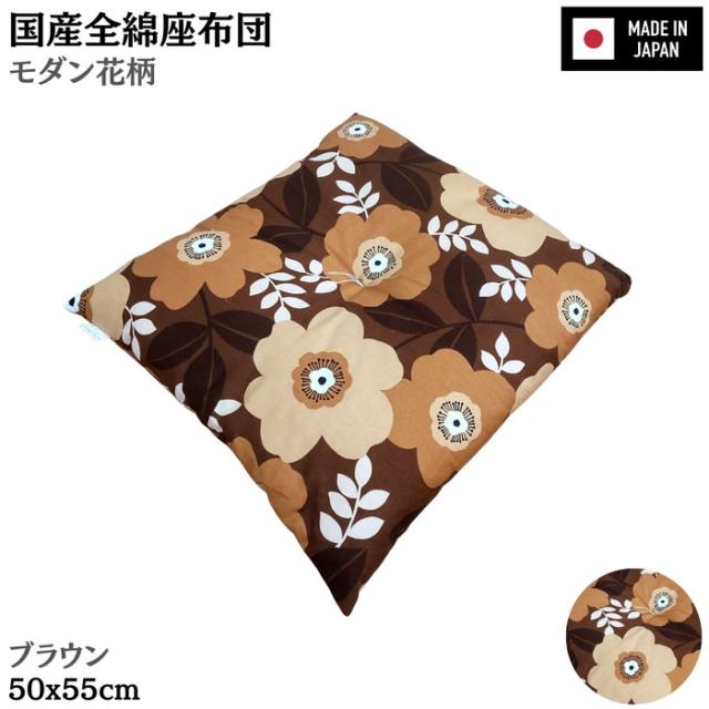 国産全綿座布団 銘仙判 モダン花柄 ブラウン 約50x55x10cm 綿100% 日本製 プリント生地 クッション