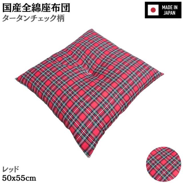国産全綿座布団 銘仙判 タータンチェック柄 レッド 約50x55x10cm 綿100% 日本製 プリント生地 クッション