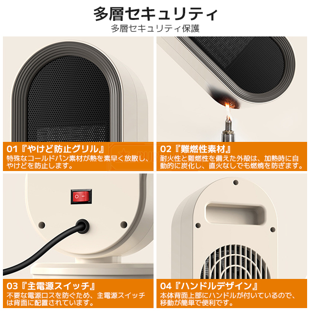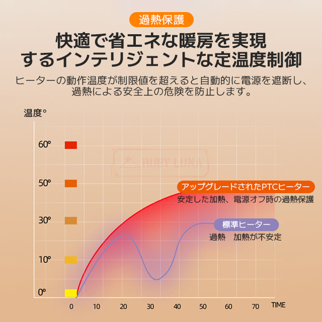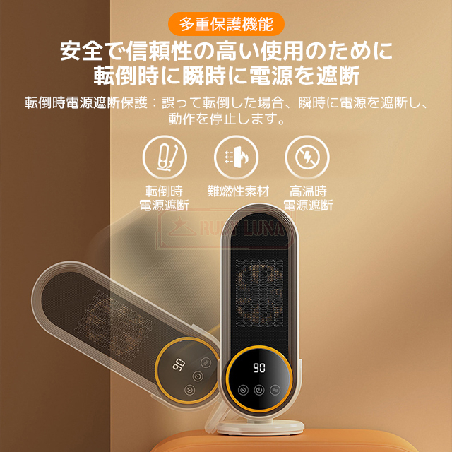 | 【転倒・過熱OFF機能】 | ◆ヒーターが転倒した場合、電源が自動的に切ってくれます。また、温度が上がりすぎると自動的に電源も切れます。子供やペットがいる方でも安心してお使いいただけます。 |