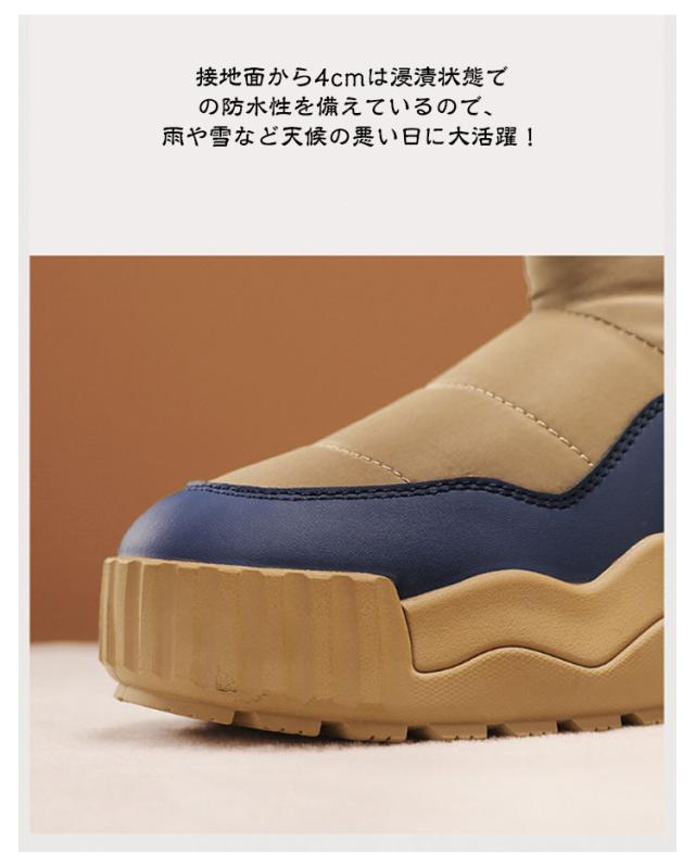 | 防水、防滑、防寒機能を備えた、メンズスノーブーツ! 接地面から4cmは浸漬状態での防水性を備えているので、雨や雪など天候の悪い日に大活躍! 内側は履き口から足の裏まで全体がモコモコのボアなので、履いた瞬間からつま先まで暖か。 グリップ性の強いソールを使用し滑りにくい設計で、雪の日などの滑りやすい路面で力を発揮! 履き口のドローコードを調節すれば冷気や雨水の侵入を防ぎます。 ファッション性に優れたデザインなので普段履きはもちろん、アウトドアシーンにおいても活動をサポートする機能性を併せ持った汎用性の高い1足に仕上がっています。 | |
