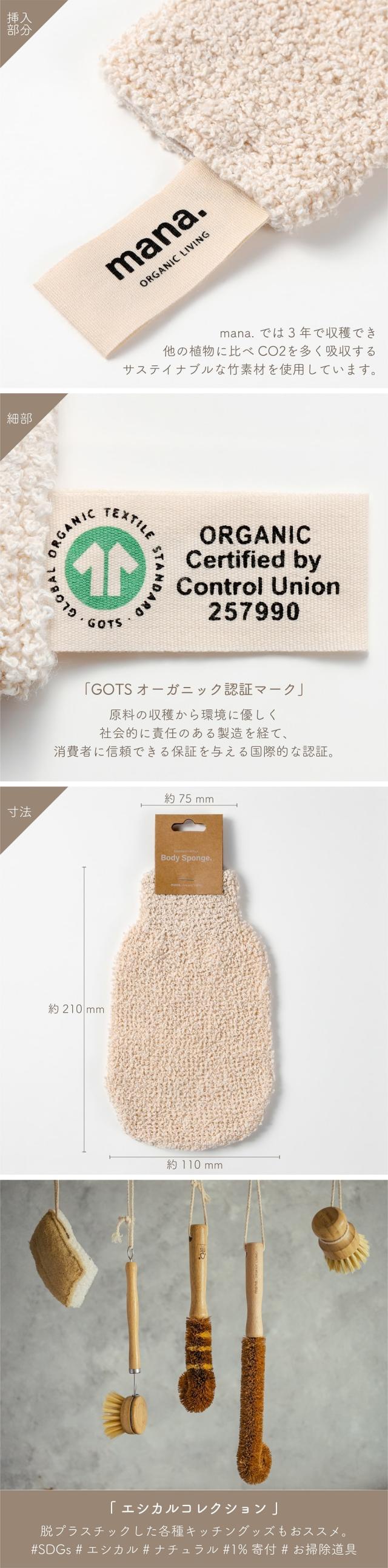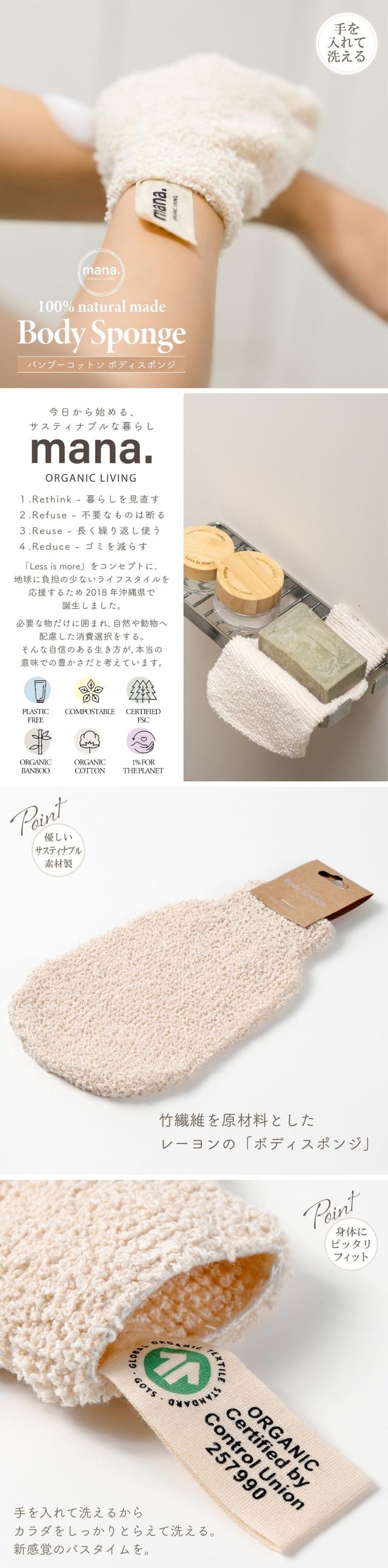 バス用品 mana. バンブーコットン ボディスポンジ 手袋型 竹繊維 レーヨン製 自然素材100% GOTSオーガニック認証 ナチュラル エシカル 脱プラスチック サスティナブル バンブー ボディタオル バスタイム バスルーム