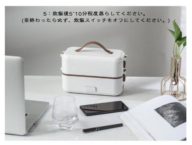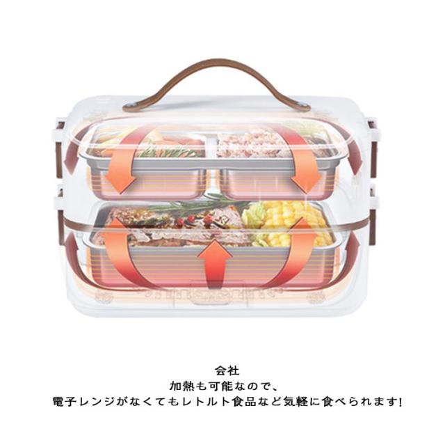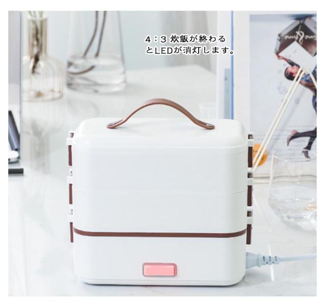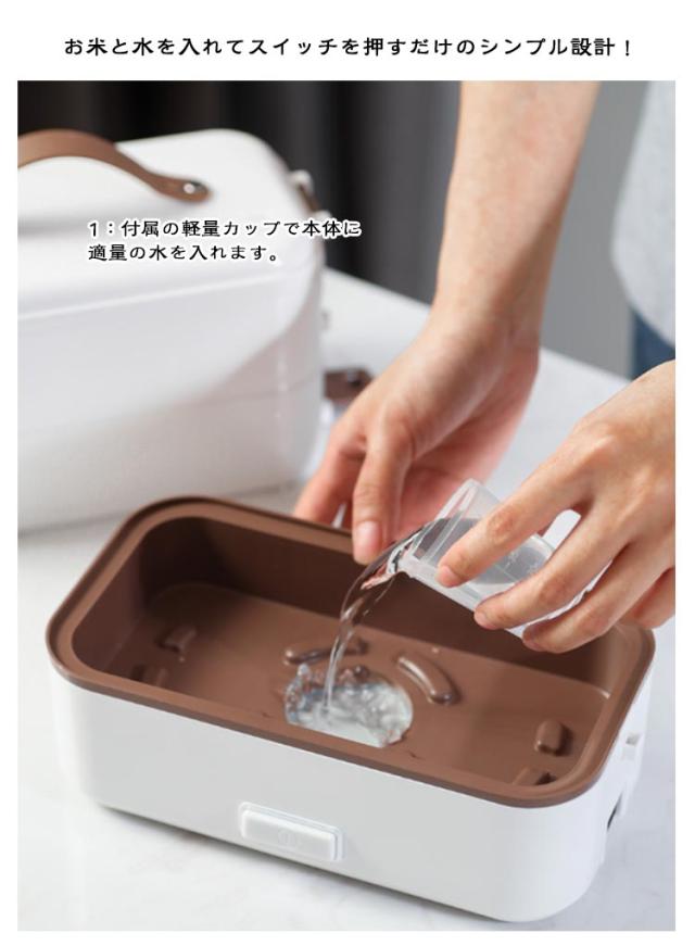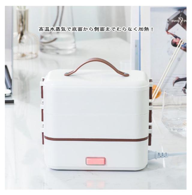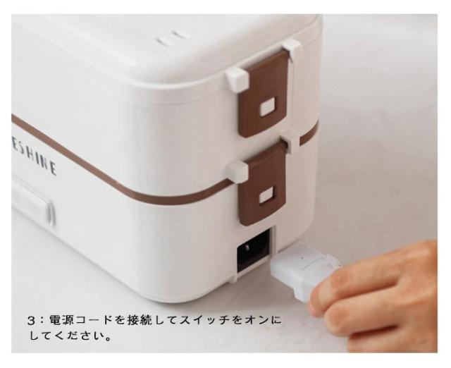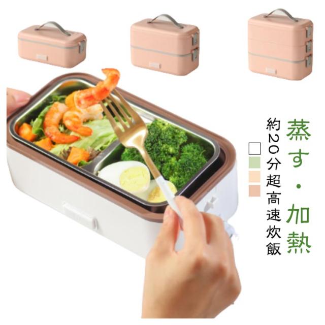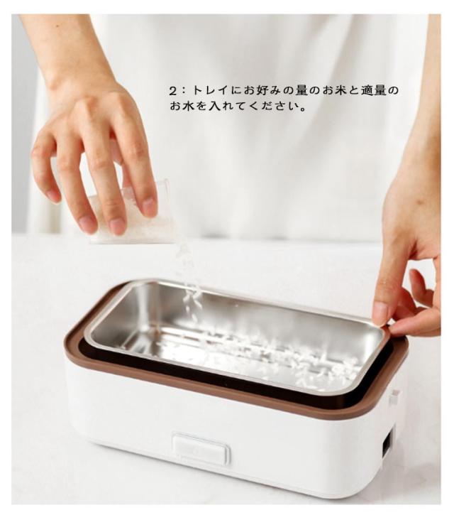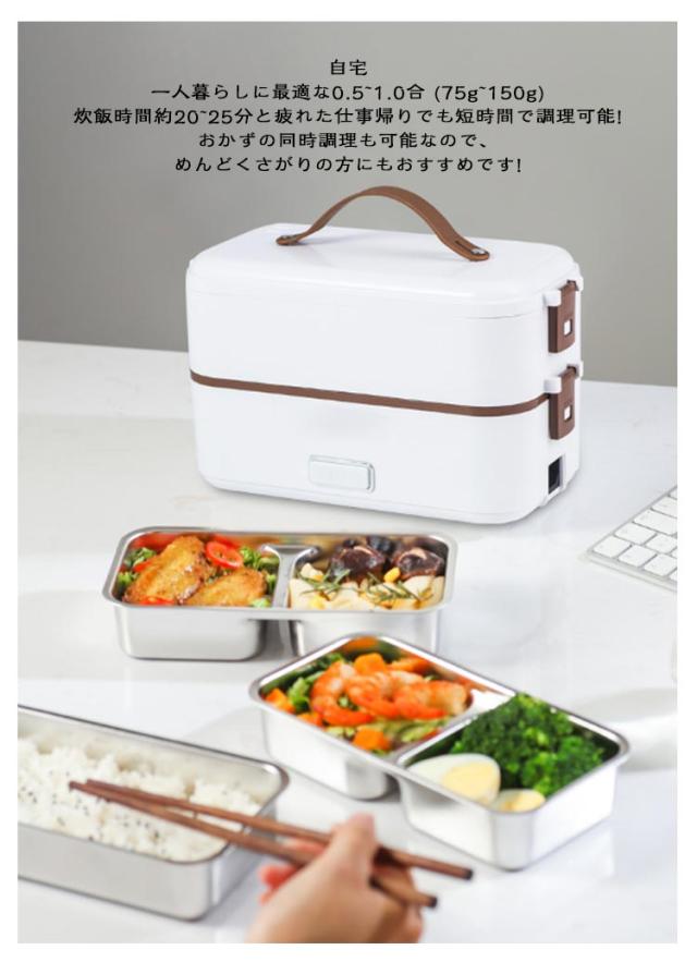 | 弁当箱 1/2/3段 蒸す・加熱 約20分超高速炊飯 ■高温水蒸気で底面から側面までむらなく加熱! ■炊く・蒸す・加熱の1台3役! ■自宅や会社で炊きたてのご飯、温かいおかずが食べられる! 自宅 一人暮らしに最適な0.5~1.0合 (75g~150g) 炊飯時間約20~25分と疲れた仕事帰りでも短時間で調理可能! おかずの同時調理も可能なので、めんどくさがりの方にもおすすめです! 会社 加熱も可能なので、電子レンジがなくてもレトルト食品など気軽に食べられます! 食品の温めも可能!! 1:温めたい食品を内釜に入れてセットしてください。 2:本体に95mlの水を入れて蓋をしっかりと閉めてください。 3:電源スイッチをいれて、約20~25分程度でできあがります。 ※時間調節はできません。 (自動停止機能により、水分がなくなるまで稼働します。) ※食品は蓋が閉まる量に調節してください。 ■約1.45kgの軽量設計で簡単に持ち運び可能♪ ■お米と水を入れてスイッチを押すだけのシンプル設計! 1:付属の軽量カップで本体に適量の水を入れます。 2:トレイにお好みの量のお米と適量のお水を入れてください。 4:3 炊飯が終わるとLEDが消灯します。 3:電源コードを接続してスイッチをオンにしてください。 5:炊飯後5~10分程度蒸らしてください。 (※終わったら必ず、炊飯スイッチをオフにしてください。) ■内蓋つきなので、蓋を閉めて冷蔵庫で保管可能! ■ステンレス製で洗いやすく、お手入れも簡単! | |