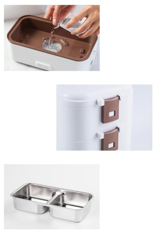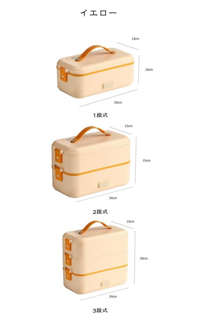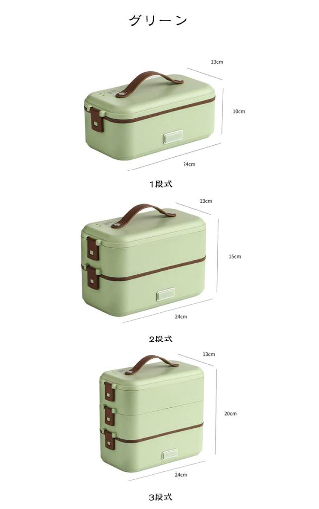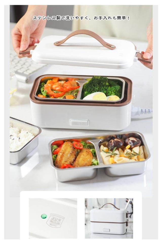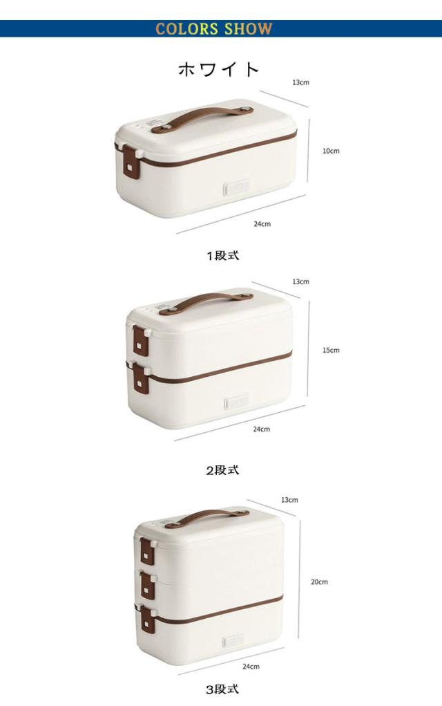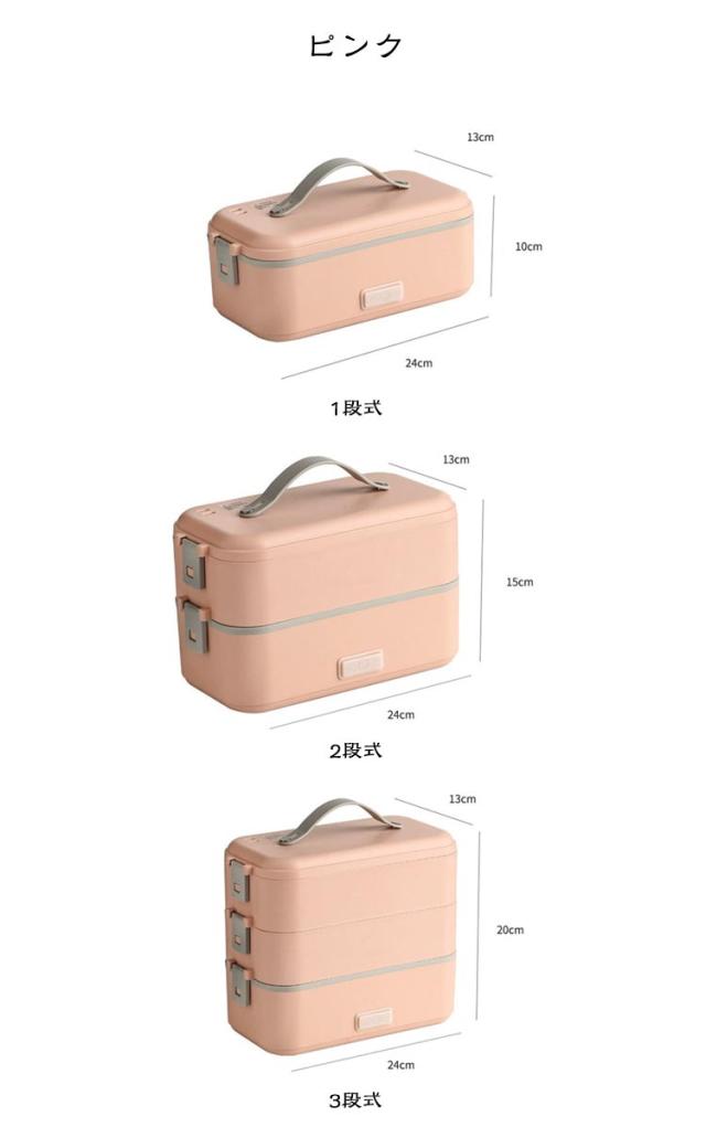 | 弁当箱 1/2/3段 蒸す・加熱 約20分超高速炊飯 ■高温水蒸気で底面から側面までむらなく加熱! ■炊く・蒸す・加熱の1台3役! ■自宅や会社で炊きたてのご飯、温かいおかずが食べられる! 自宅 一人暮らしに最適な0.5~1.0合 (75g~150g) 炊飯時間約20~25分と疲れた仕事帰りでも短時間で調理可能! おかずの同時調理も可能なので、めんどくさがりの方にもおすすめです! 会社 加熱も可能なので、電子レンジがなくてもレトルト食品など気軽に食べられます! 食品の温めも可能!! 1:温めたい食品を内釜に入れてセットしてください。 2:本体に95mlの水を入れて蓋をしっかりと閉めてください。 3:電源スイッチをいれて、約20~25分程度でできあがります。 ※時間調節はできません。 (自動停止機能により、水分がなくなるまで稼働します。) ※食品は蓋が閉まる量に調節してください。 ■約1.45kgの軽量設計で簡単に持ち運び可能♪ ■お米と水を入れてスイッチを押すだけのシンプル設計! 1:付属の軽量カップで本体に適量の水を入れます。 2:トレイにお好みの量のお米と適量のお水を入れてください。 4:3 炊飯が終わるとLEDが消灯します。 3:電源コードを接続してスイッチをオンにしてください。 5:炊飯後5~10分程度蒸らしてください。 (※終わったら必ず、炊飯スイッチをオフにしてください。) ■内蓋つきなので、蓋を閉めて冷蔵庫で保管可能! ■ステンレス製で洗いやすく、お手入れも簡単! | |