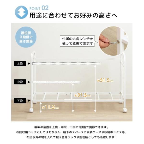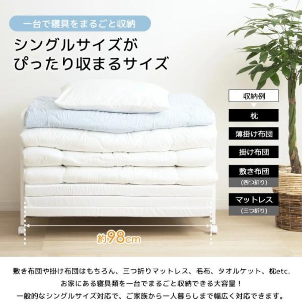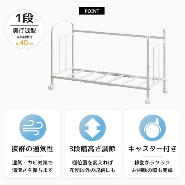 布団収納 ラック 1段 奥行浅型 キャスター付き 押し入れ クローゼット シンプル スチール 丈夫 ふとん 高さ調節 棚 通気性 白 当日出荷 ID011
