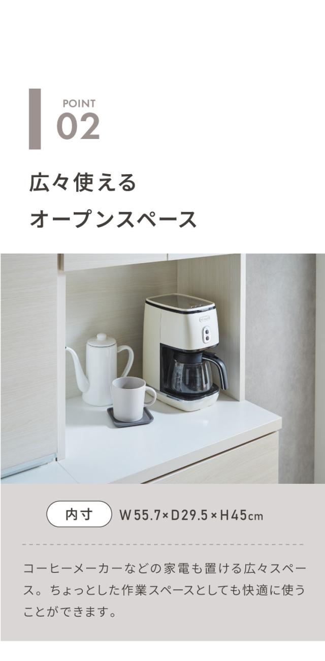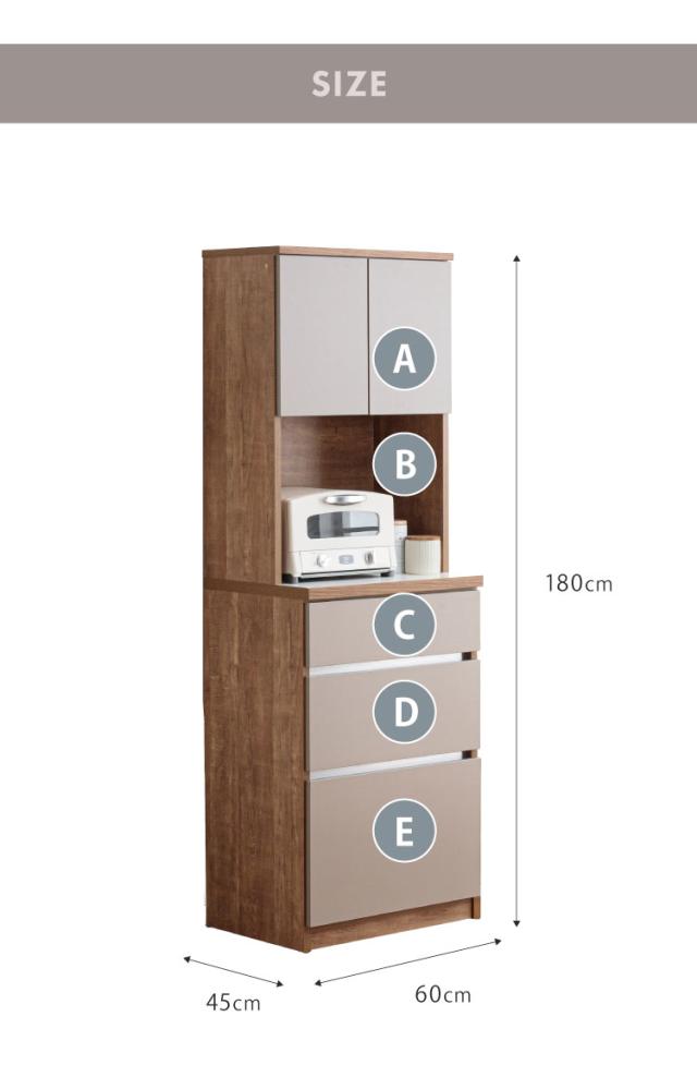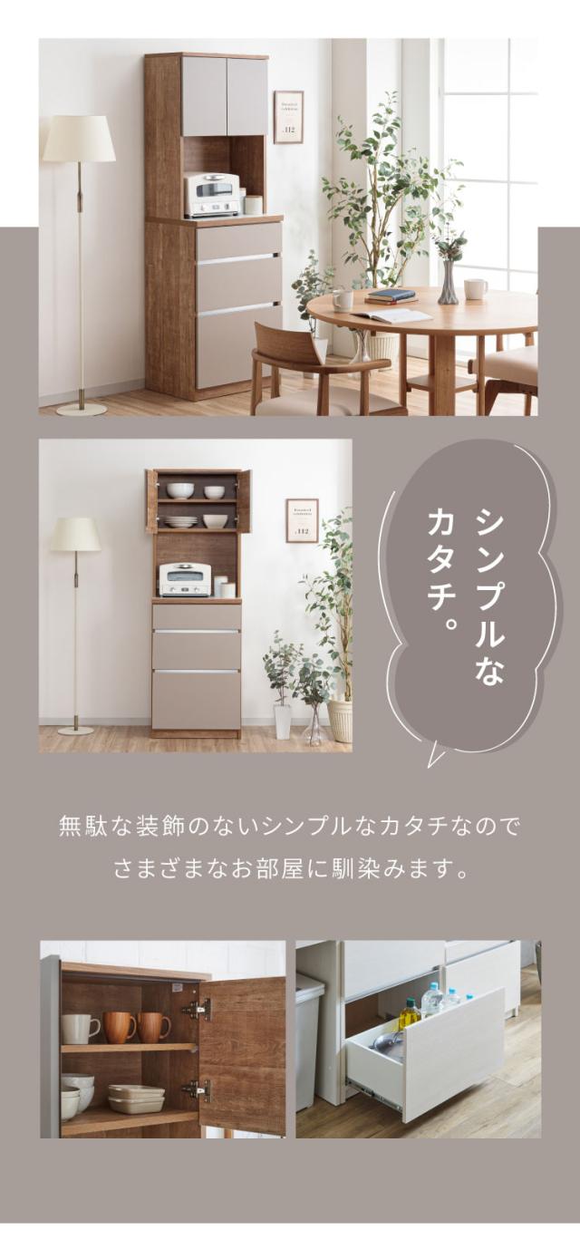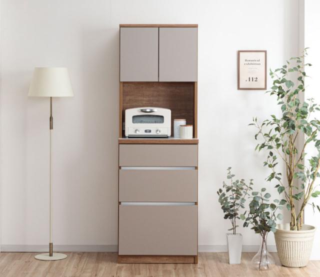 グレージュ、ブラウン、ホワイトの3色で展開されるモダンなデザインが特徴な食器棚。高さ180cmのハイタイプ設計で、キッチン周りの食器や家電、食品ストックをひとまとめに大容量収納できます。「おしゃれなキッチン空間」と「使いやすい収納力」を両立させたい方にぴったりの一台です。
