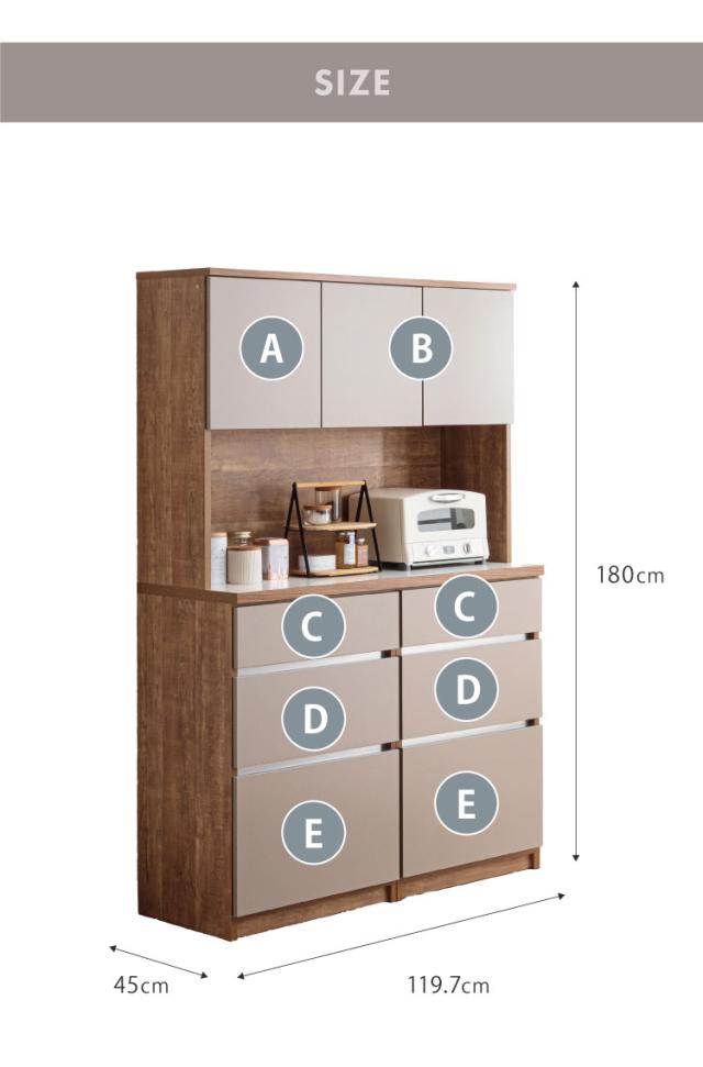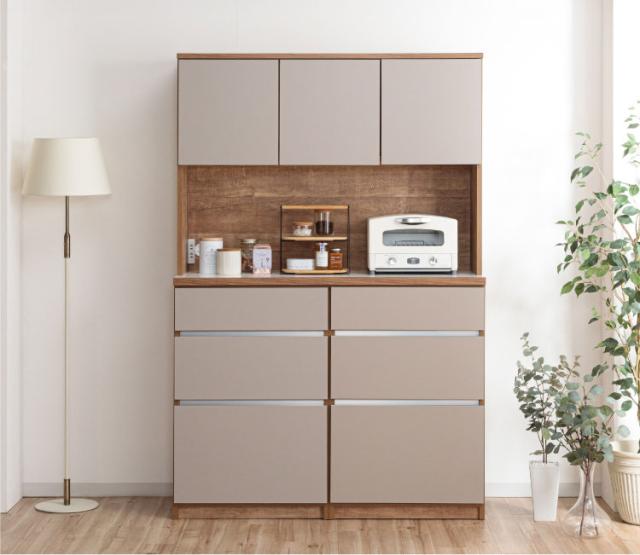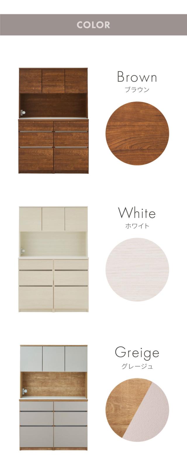 グレージュ、ブラウン、ホワイトの3色で展開されるモダンなデザインが特徴な食器棚。高さ180cmのハイタイプ設計で、キッチン周りの食器や家電、食品ストックをひとまとめに大容量収納できます。「おしゃれなキッチン空間」と「使いやすい収納力」を両立させたい方にぴったりの一台です。下台は左右の入れ替えが可能なので、お好みの並べ位置で快適にご使用いただけます。