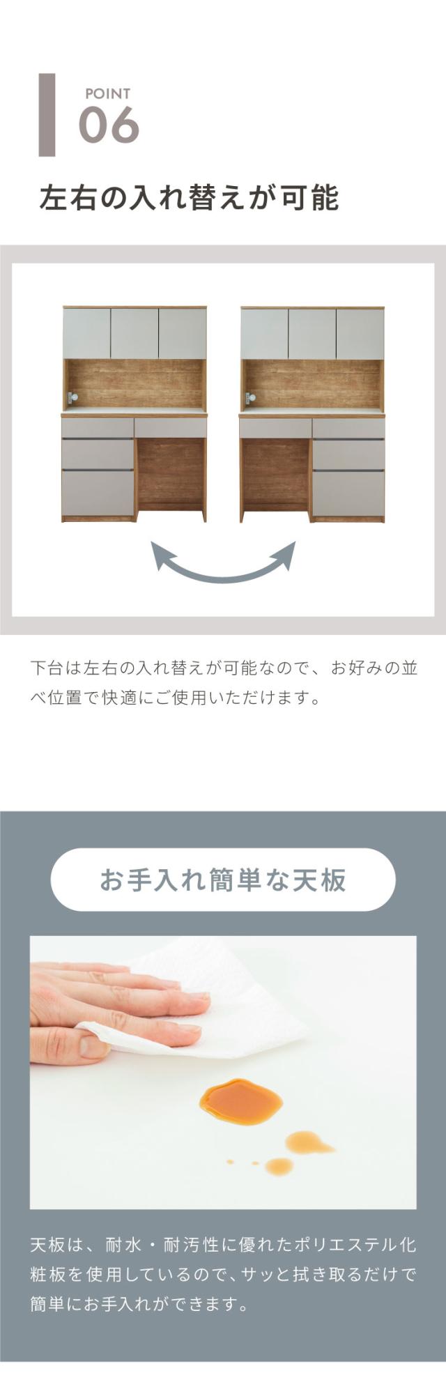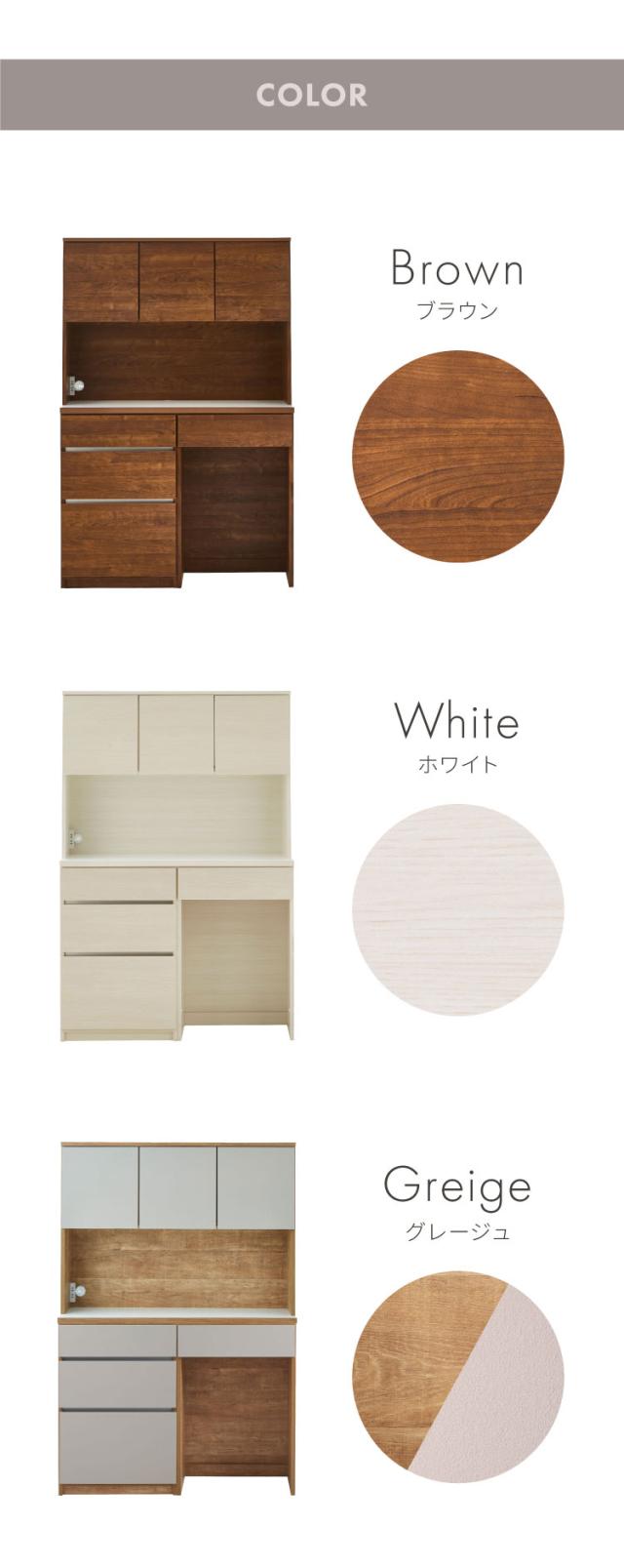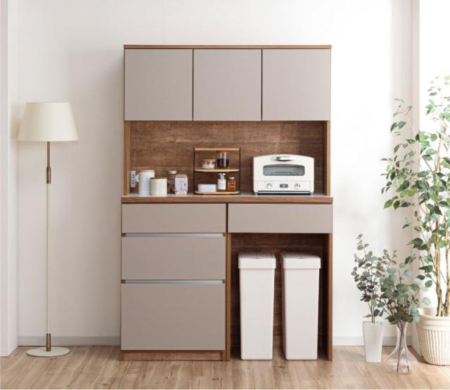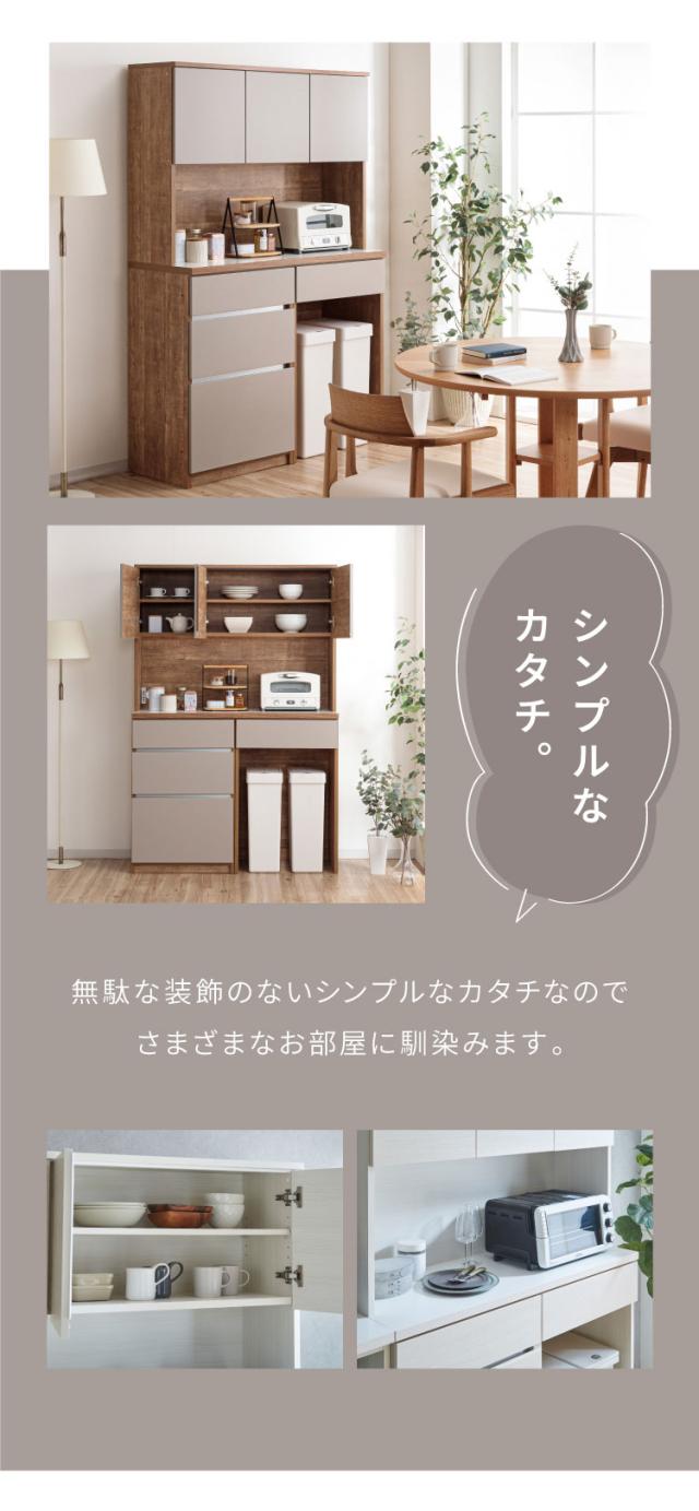 グレージュ、ブラウン、ホワイトの3色で展開されるモダンなデザインが特徴な食器棚。高さ180cmのハイタイプ設計で、キッチン周りの食器や家電、食品ストックをひとまとめに大容量収納できます。「おしゃれなキッチン空間」と「使いやすい収納力」を両立させたい方にぴったりの一台です。下台は左右の入れ替えが可能なので、お好みの並べ位置で快適にご使用いただけます。