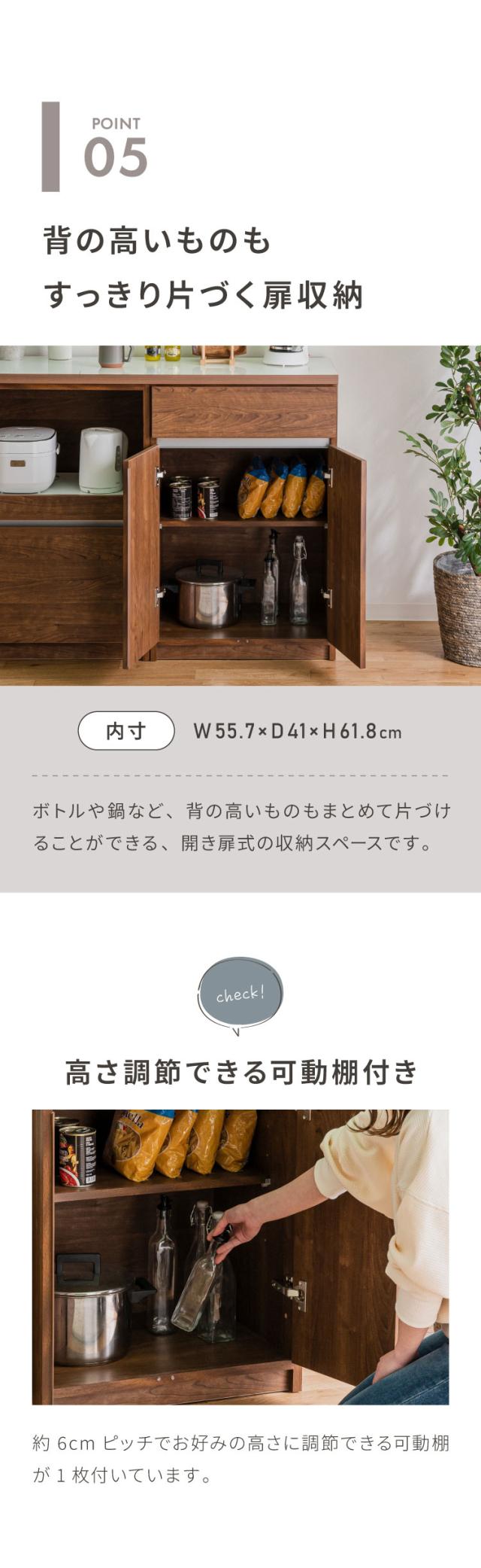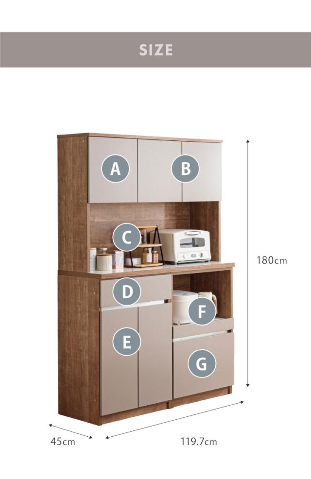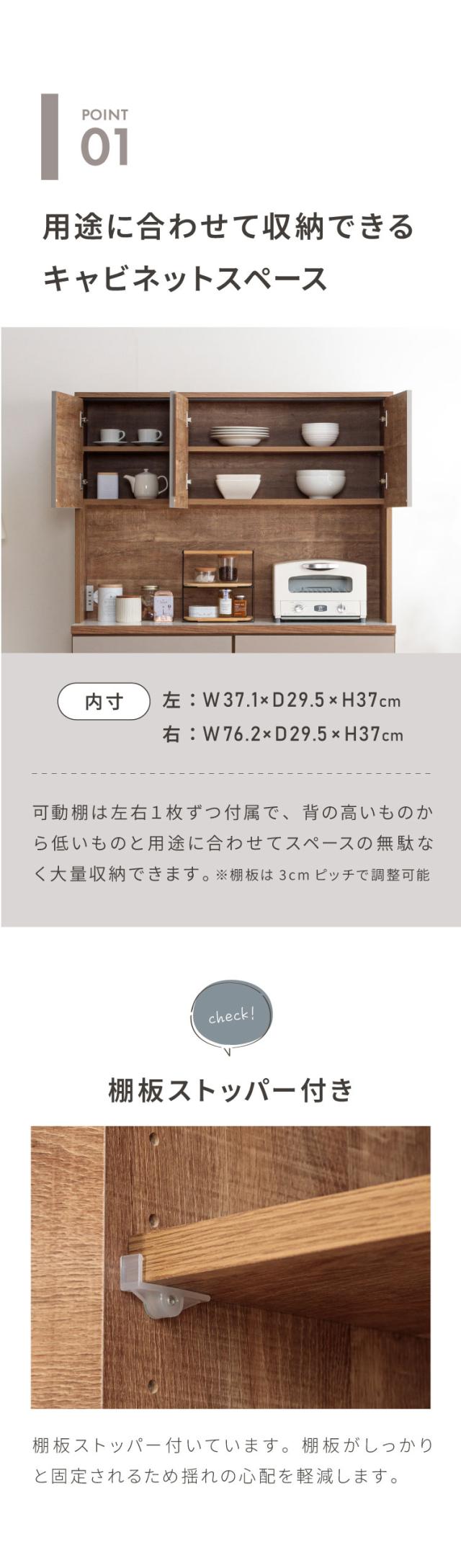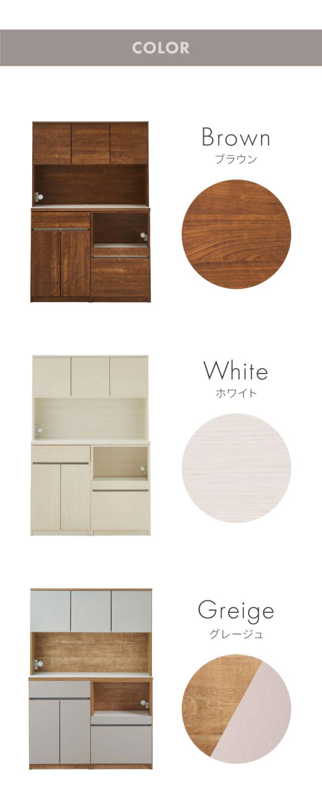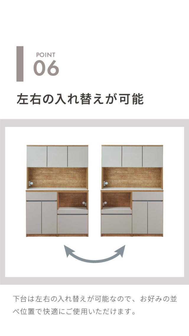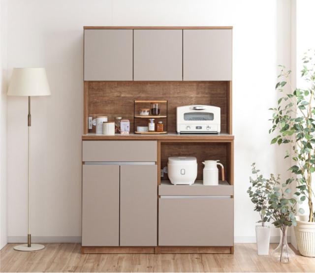 グレージュ、ブラウン、ホワイトの3色で展開されるモダンなデザインが特徴な食器棚。高さ180cmのハイタイプ設計で、キッチン周りの食器や家電、食品ストックをひとまとめに大容量収納できます。「おしゃれなキッチン空間」と「使いやすい収納力」を両立させたい方にぴったりの一台です。下台は左右の入れ替えが可能なので、お好みの並べ位置で快適にご使用いただけます。