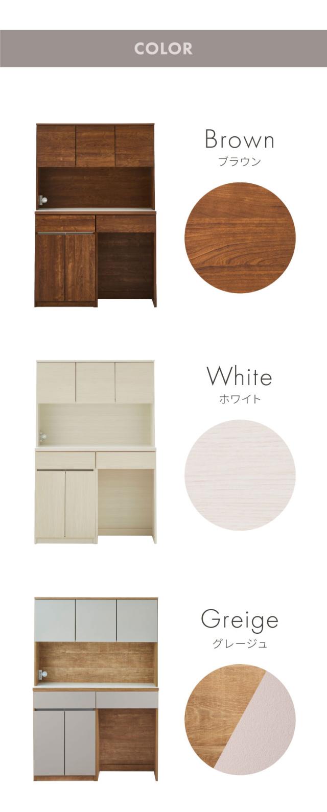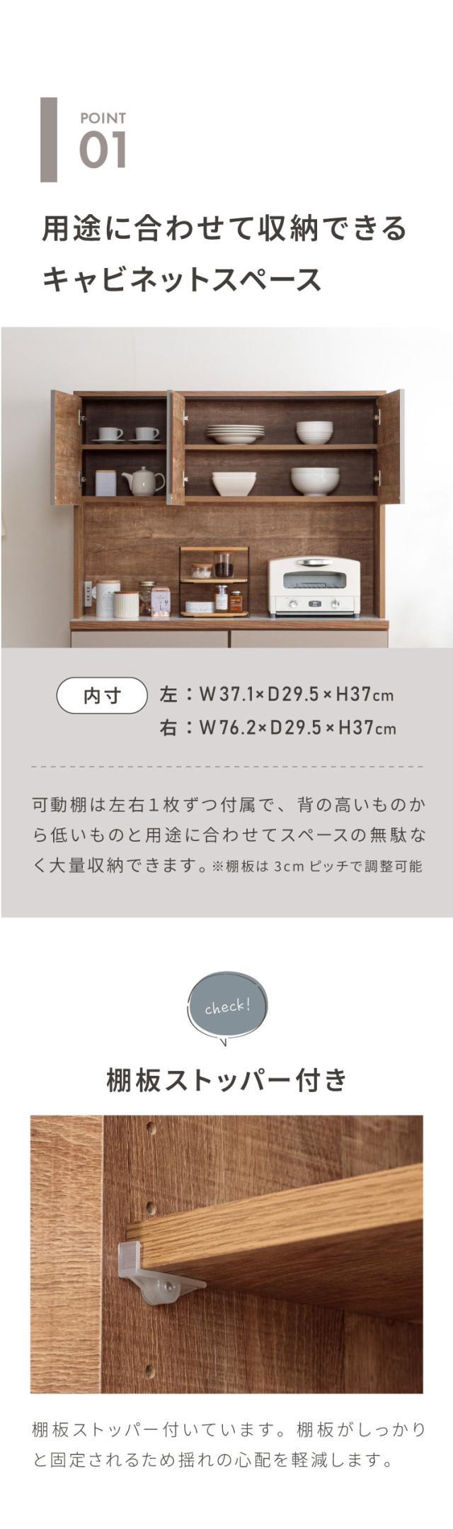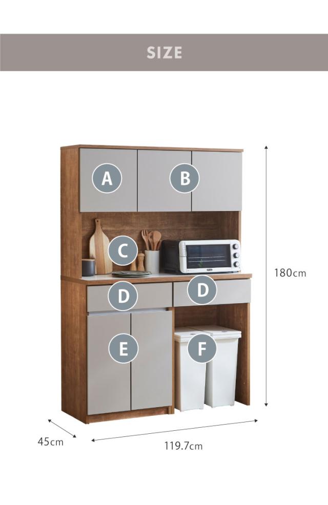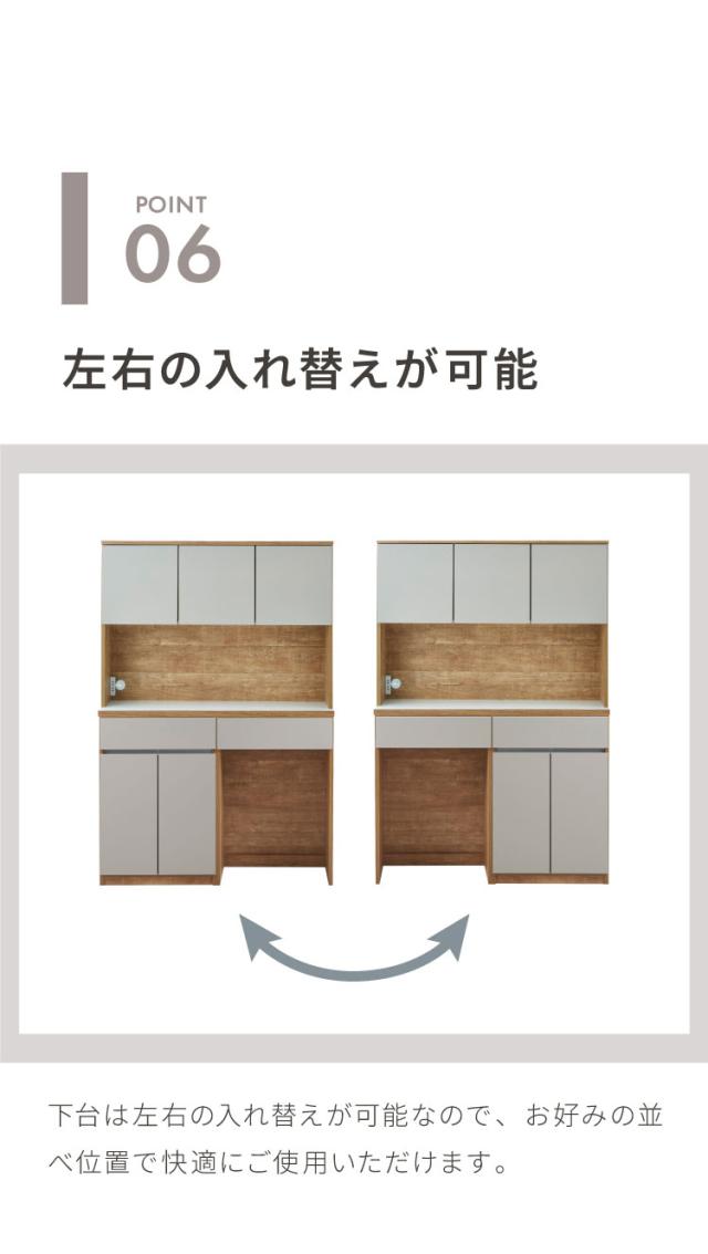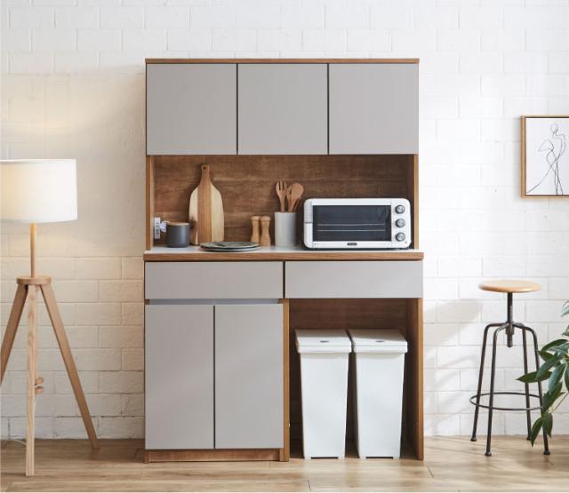 グレージュ、ブラウン、ホワイトの3色で展開されるモダンなデザインが特徴な食器棚。高さ180cmのハイタイプ設計で、キッチン周りの食器や家電、食品ストックをひとまとめに大容量収納できます。「おしゃれなキッチン空間」と「使いやすい収納力」を両立させたい方にぴったりの一台です。下台は左右の入れ替えが可能なので、お好みの並べ位置で快適にご使用いただけます。