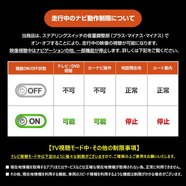楽しいドライブをもっと快適に! 走行中に映像が映らないテレビやDVDの視聴を可能にするハーネスキットです。 ロングドライブや渋滞時にも、同乗者を退屈させずに楽しい快適な車内へ! TV・DVDの視聴が可能 走行中の視聴制限を解除することで、長距離ドライブなどでもTV・DVDを見れるので同乗者が退屈せず快適に車内を過ごすことができます。 カプラーオン+アース接続で簡単取り付け 取り付けもカプラ—オンとアース接続で簡単に取り付ける事ができます。 |