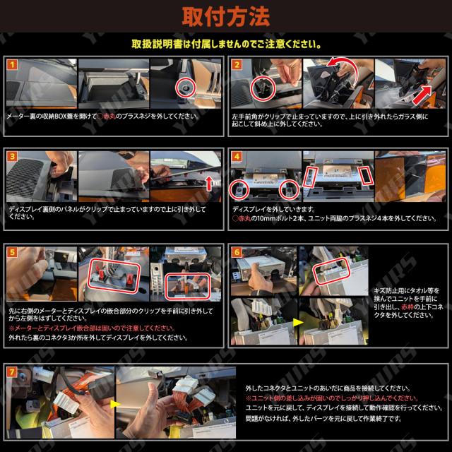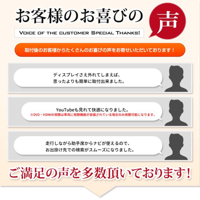 ■ディスプレイを外す際にメーター部との結合部が固いため注意が必要です。 ■DVD・HDMIの視聴は車両に視聴機器が装備されている場合のみ視聴可能になります。 ■ドライバーによる走行中のナビ操作は大変危険です!! |