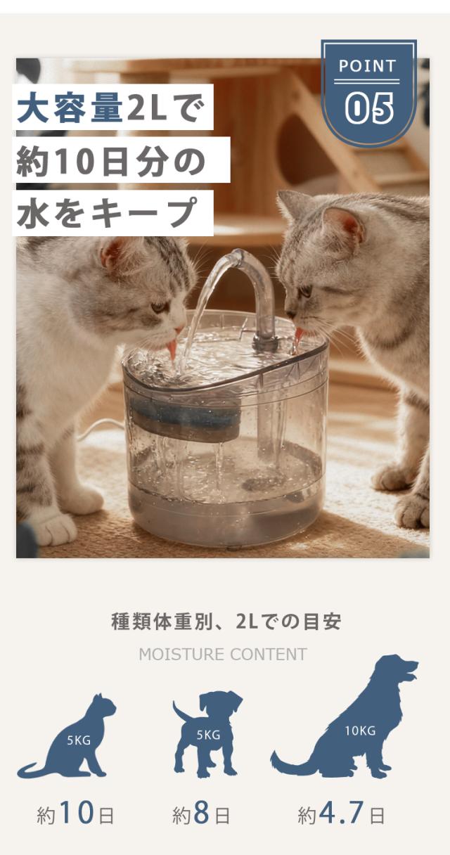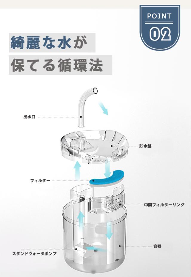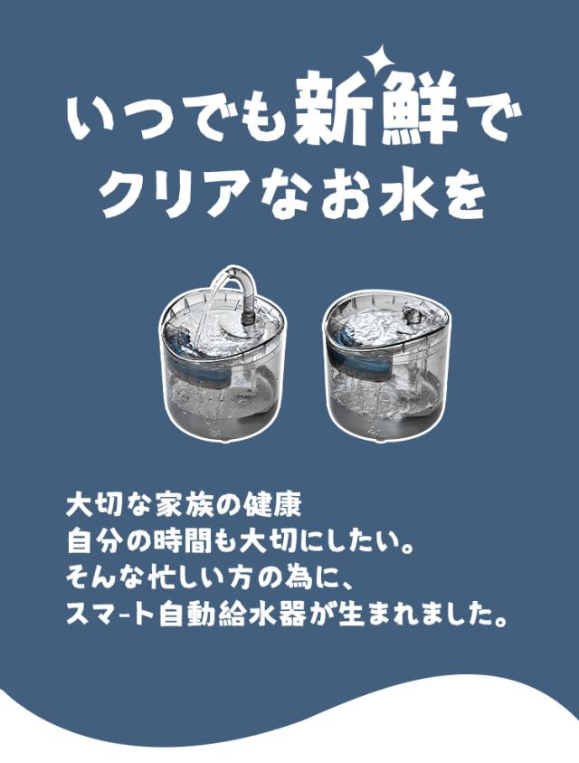 ■2Lの大容量タンクでいつでも新鮮な水を循環供給。蛇口式のやさしい流れが猫ちゃん・ワンちゃんの飲水意欲を高め、毎日の健康習慣をしっかりサポート。
