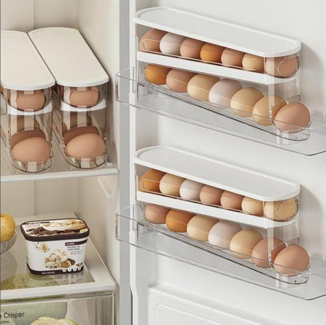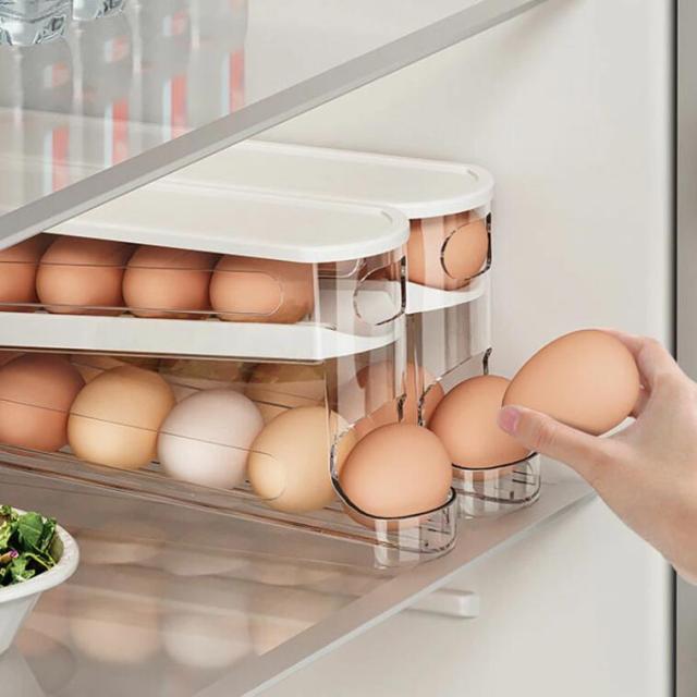 【省スペース】: スリムなデザインの自動卵保存容器オーガナイザー。この卵箱は冷蔵庫のサイドドアに便利に設置できます。卵の保管ニーズを満たす省スペースのソリューションです。冷蔵庫、サイドボード、キッチンなどで使用するのに最適で、家をきれいにします。コンパクトなサイズで小型冷蔵庫にも対応できます。