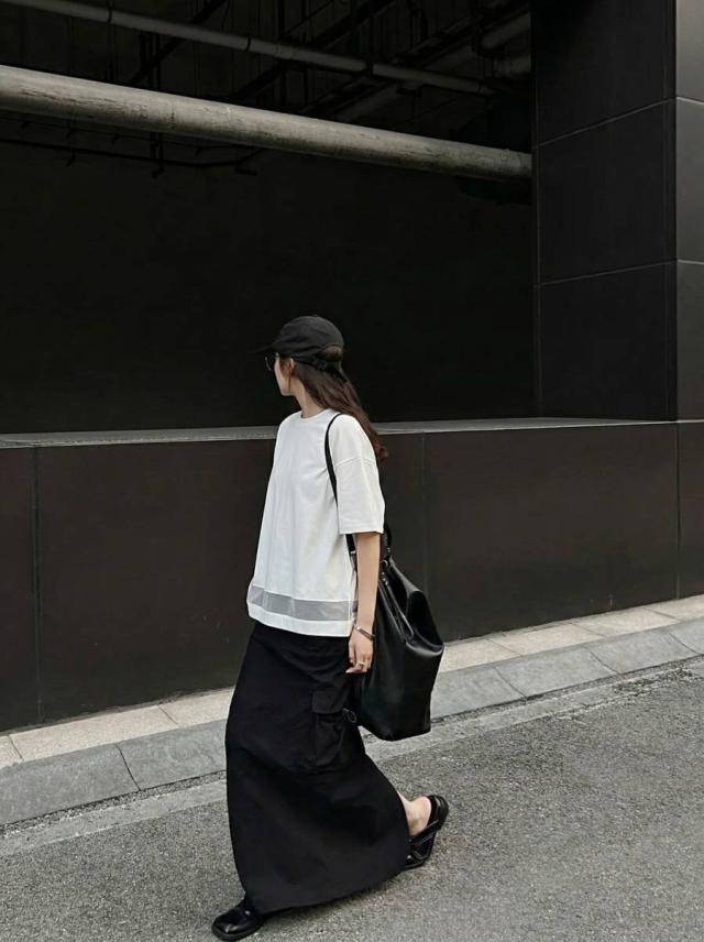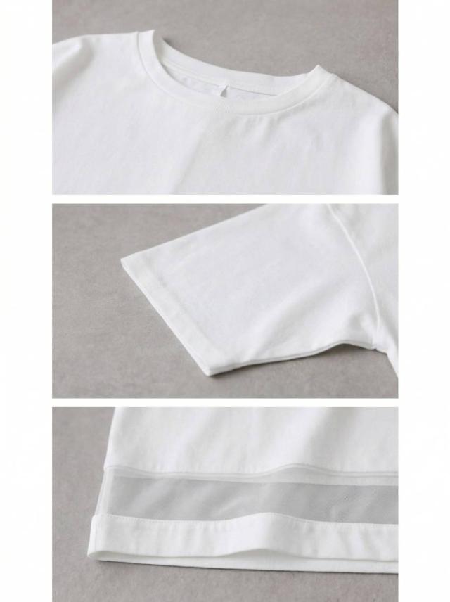 丈感はやや長めで、裾に施したシアー切替が透け感とレイヤード風の奥行きを演出します。