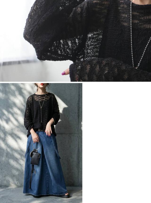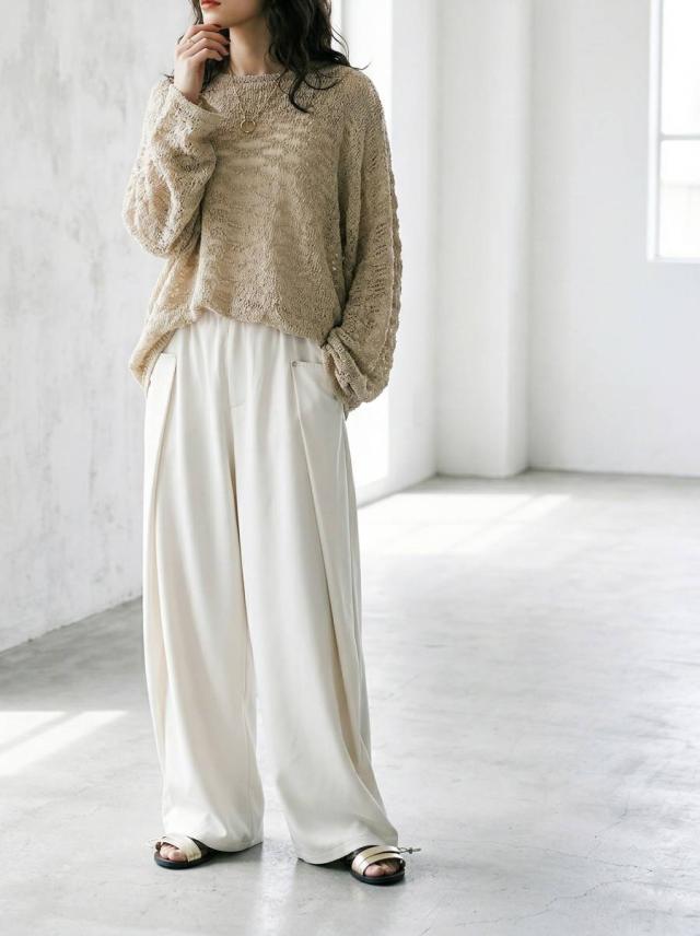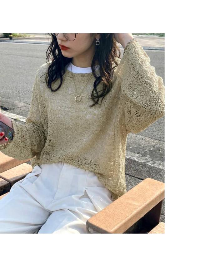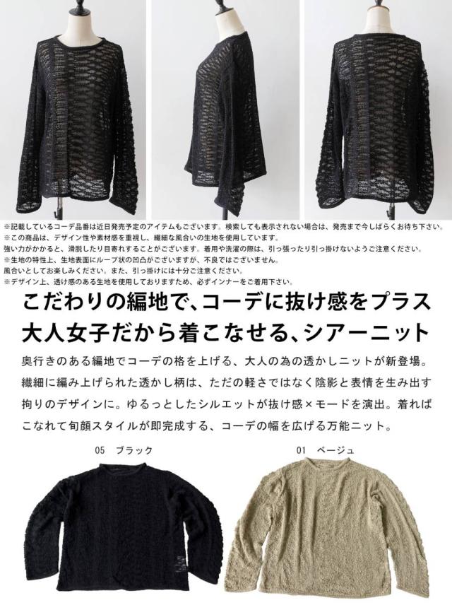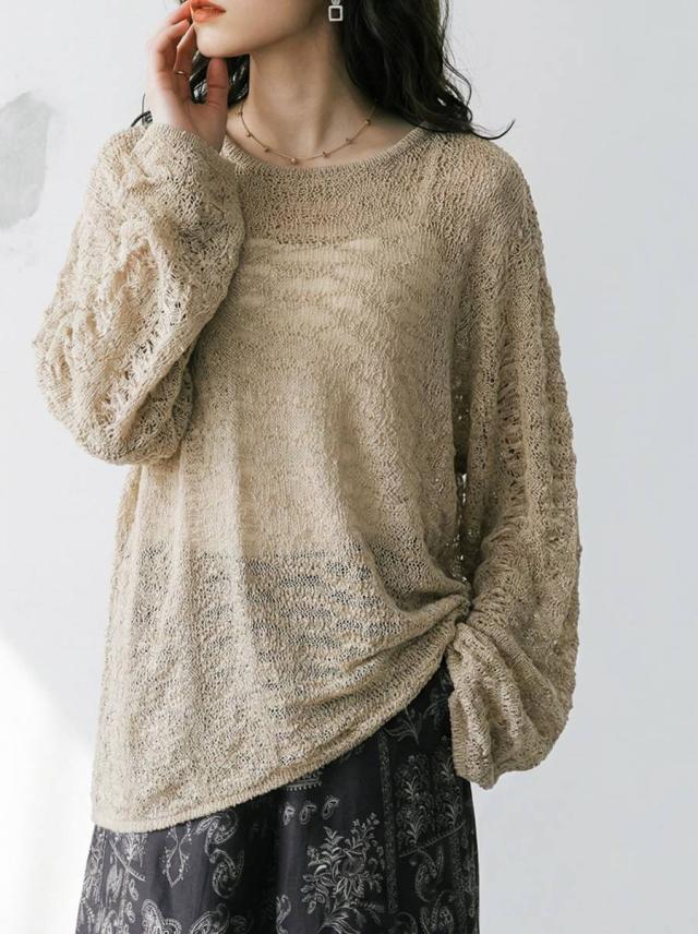 ea-00161 クルーネック 透け感 編み柄 トップス ゆったり 体型カバー シアー 透け感 ルーズシルエット 編み柄 レイヤード 重ね着 軽やか 風合い 大人カジュアル ナチュラル 着回し