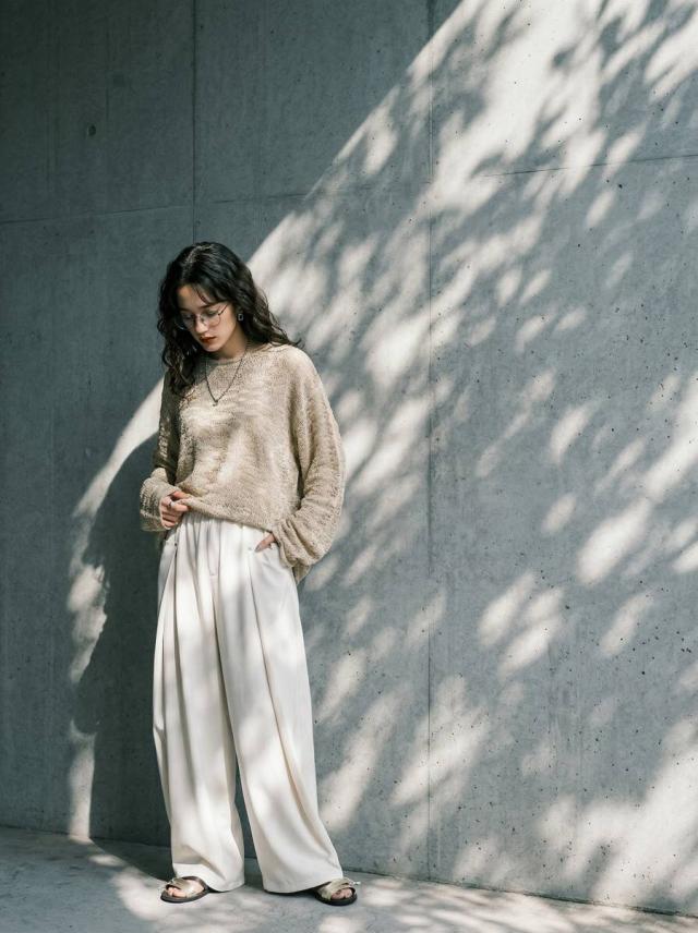 クルーネックのネックラインが程よい抜け感を生み、女性らしいバランスに整えます。